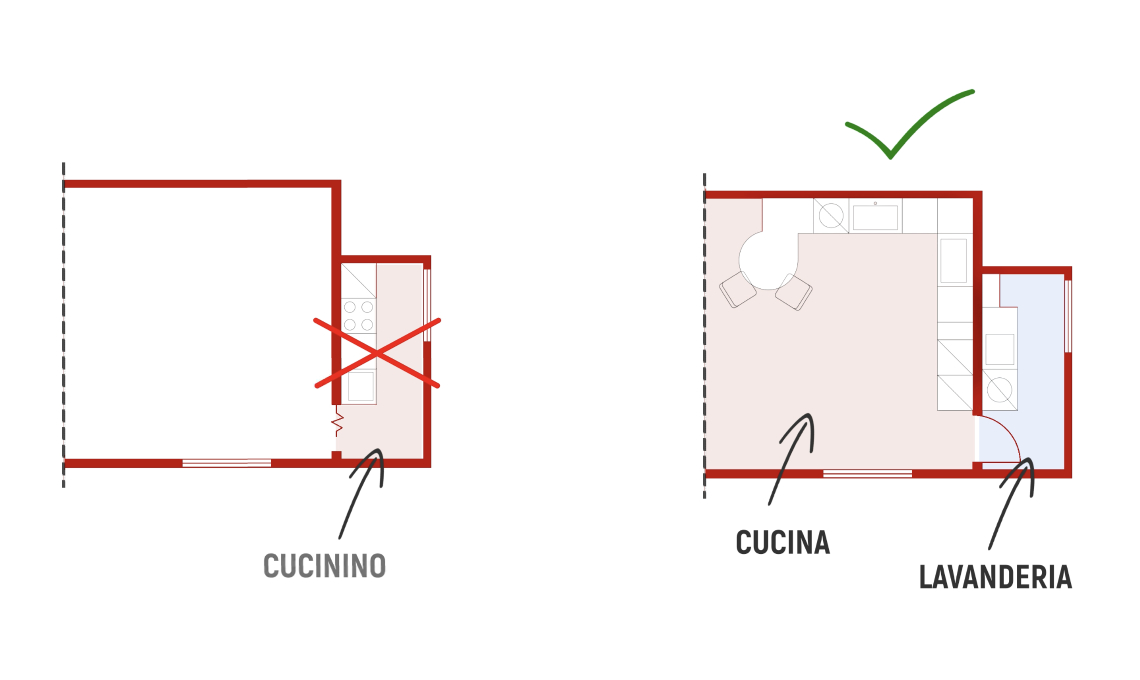 C’era una volta un cucinotto, piccolo e scomodo per chi ama cucinare e invitare gli amici. E c’era anche un grande soggiorno che avrebbe potuto ospitare una cucina a vista senza nessun problema. Laura e Marco hanno quindi deciso di realizzare un living con cucina (scegliendo Jeometrica, firmata da Luca Nichetto per Scavolini) molto più comodo per le cene in compagnia - mantenendo comunque nello stesso ambiente anche un’ampia zona relax - e di sfruttare l’ex-cucinotto per creare una zona lavanderia, ‘nascosta’ da una porta a filo muro.