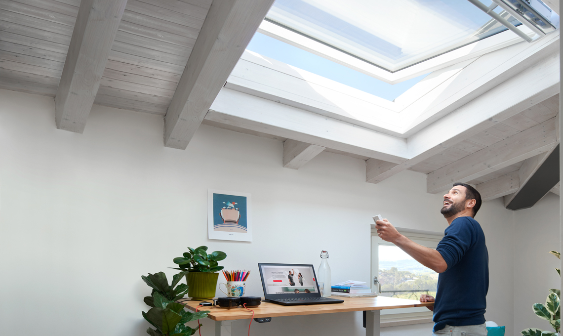 La finestra per tetti panoramica permette di avere una postazione di lavoro illuminata alla perfezione… e di vagare con lo sguardo nei momenti di pausa.