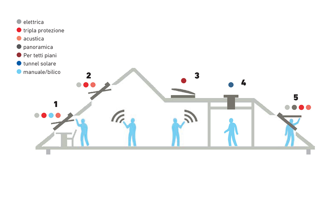 Ad altezza uomo sulla falda inclinata puoi scegliere la finestra a bilico [1] oppure quella panoramica con apertura vasistas [5], manuale o elettrica: in entrambi i casi potrai scegliere tra i modelli Tripla Protezione, con eccezionale resistenza alla grandine, o Acustica, che protegge la casa anche dai rumori. Per aperture poste più in alto [2], la soluzione ideale è Integra, la finestra per tetti elettrica e solare. Se invece il tetto è piano, puoi scegliere una finestra apribile [3], oppure un tunnel solare [4], ideale per illuminare zone cieche e in grado di coprire una distanza fino a 10 metri fra tetto e ambiente.