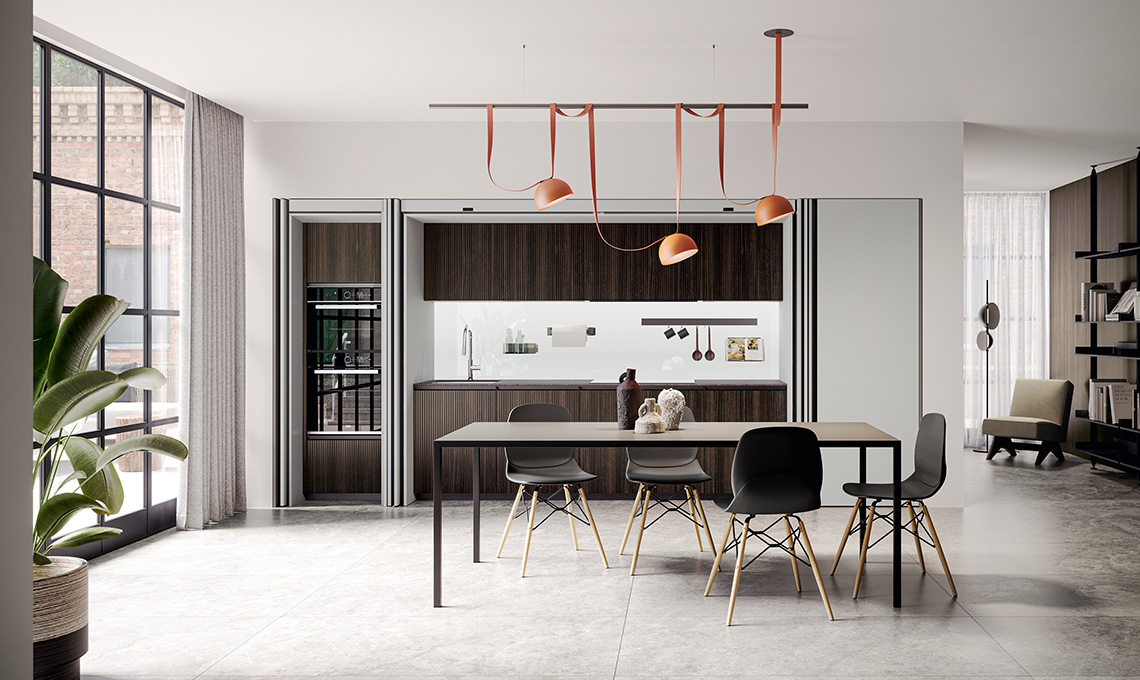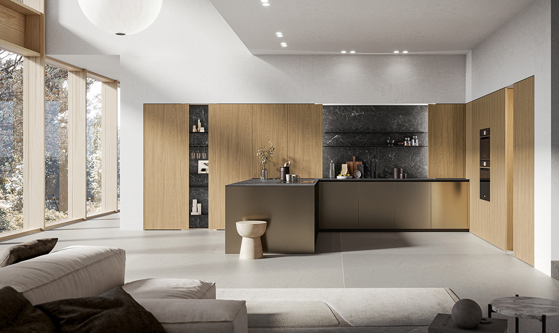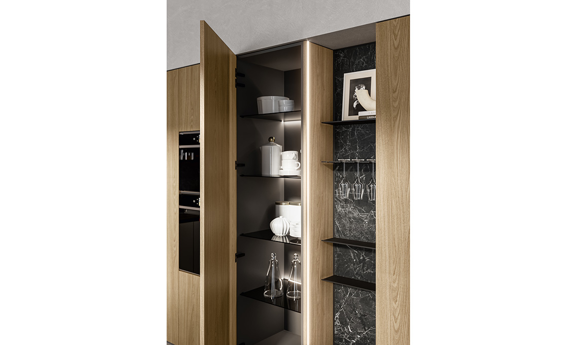 La cucina inserita in un open space con il living è una soluzione di grande attualità, adatta a superfici ampie ed anche a metrature più o meno ridotte in cui si avverte la necessità di compattare l’arredo in un unico ambiente ben progettato. Questa soluzione gioca su una proposta priva di pensili, resa scenografica dai raffinati volumi che dominano la scena, dall’effetto riflettente del PET inox delle basi, dall’eleganza del Laminam greco nero dei top e degli schienali delle boiserie LAB. Quest’ultimo è proposto in sottili lastre ceramiche ecosostenibili, ottenute da materiali in gran parte naturali. L’anta Lateral è perfetta accostata a una boiserie. Da chiusa dissimula lo spazio in più di lato, rispetto alla scocca della colonna che va a chiudere. La superficie eccedente serve come presa per l’apertura oltre che per nascondere l'illuminazione posta in verticale lungo i fianchi. In fase d'utilizzo, l’anta Lateral delle colonne, in finitura rovere canapa, diviene una quinta dall'effetto teatrale, che svela i ripiani in raffinato vetro fumé della colonna e risplende di luce.
