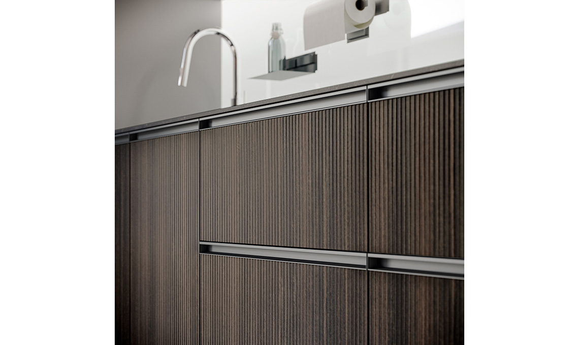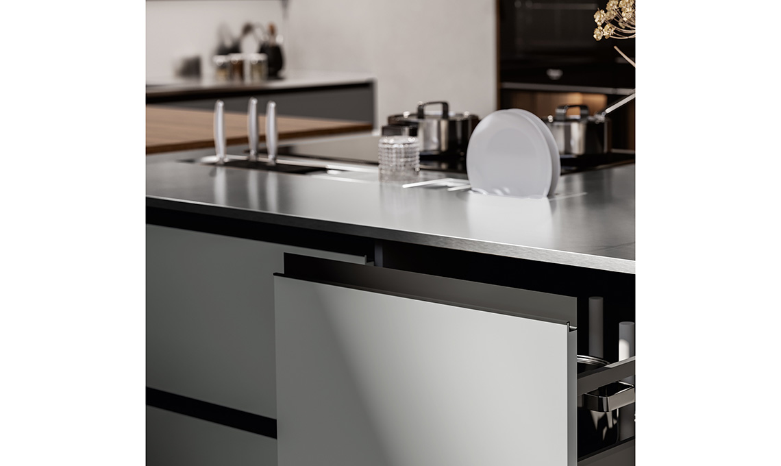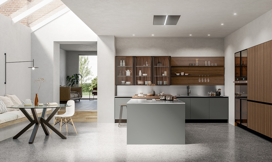 Una composizione, in finiture selenio maxximatt ed eucalipto noce, che occupa una stanza dedicata, con design lineare ma d’impatto perché acquista ritmo grazie all’ampia penisola centrale, alla boiserie attrezzata, che si ritrae rispetto ai pensili, e alle ante in vetro dei pensili stessi e delle vicine colonne con i forni. Sono presenti un piano snack con sgabelli, un’area con tavolo da pranzo, oltre ad alcuni elementi e accessori eco-friendly realizzati con materiali riciclabili come il top in acciaio inox satinato, le maniglie Profilo, gli zoccoli in alluminio, e le ante Teca in alluminio e vetro. La penisola è composta da una doppia fila di basi, una accessibile dal lato pranzo, l’altra da quello operativo per aumentare lo spazio per contenere e poterlo suddividere in modo funzionale alle diverse esigenze. I flussi di lavoro saranno così ben organizzati e potranno svolgersi in modo fluido.