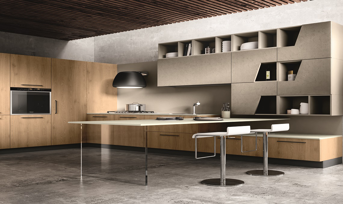 Il modello Ikona ha un forte impatto estetico e finiture di alta qualità. Il gioco dell’anta sagomata a tagli obliqui, dà un tocco di personalità alla cucina e crea forme inconsuete, che possono estendersi anche nella zona living, offrendo una curata continuità estetica. Il vetro che sostiene la penisola aggiunge leggerezza e luminosità all’ambiente. Disponibile in 15 colori, anche Ikona è interamente progettabile su misura.