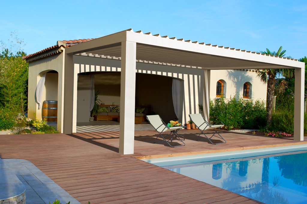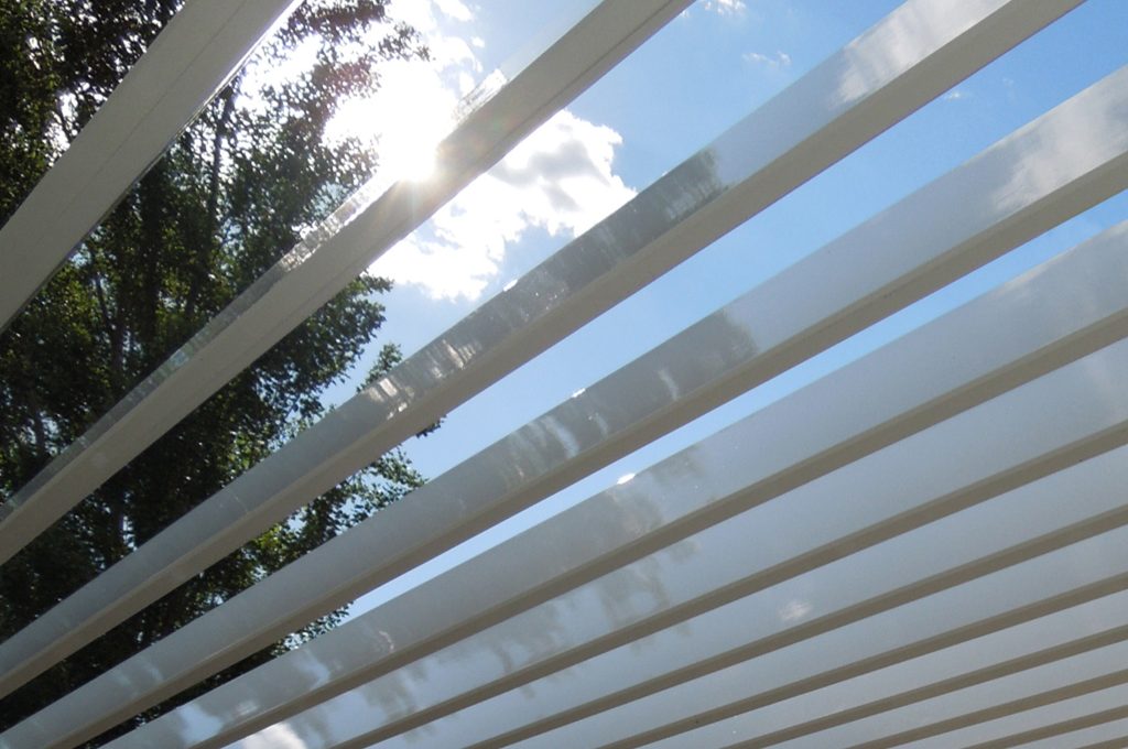 Il trucco sta tutto nelle lamelle orientabili che compongono la copertura: modificandone l’orientamento (da 0°a 140°) è possibile proteggere e climatizzare lo spazio a seconda delle esigenze.