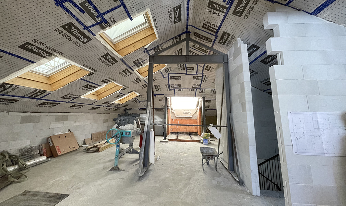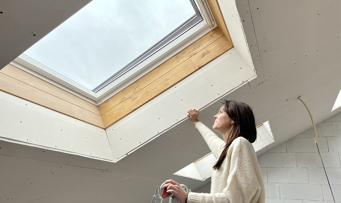 Per inondarla di luce naturale, hanno scelto finestre da tetto VELUX, modello VELUX INTEGRA®, grandi, con sensore antipioggia che funziona con pannelli solari e tende oscuranti.