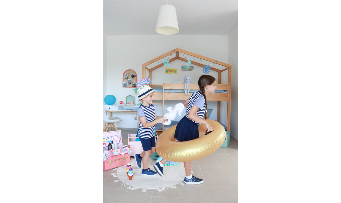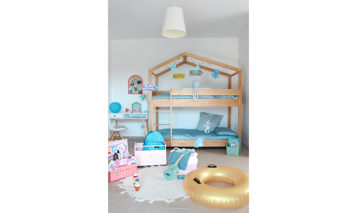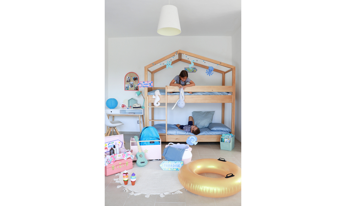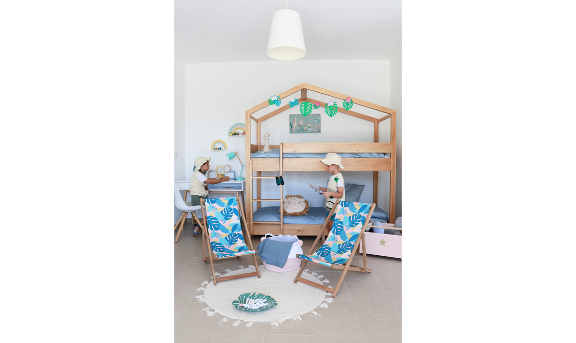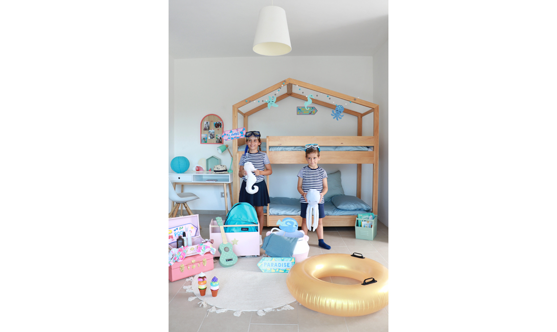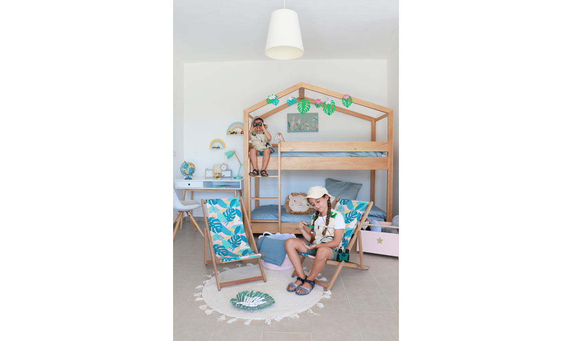 Prima di tutto, si parte dagli elementi di base, come il letto a castello a capanna, la scrivania e la lampada da tavolo; poi con l'aiuto di qualche arredo aggiuntivo e qualche elemento decorativo, la cameretta si trasforma in una spiaggia, o in una giungla!