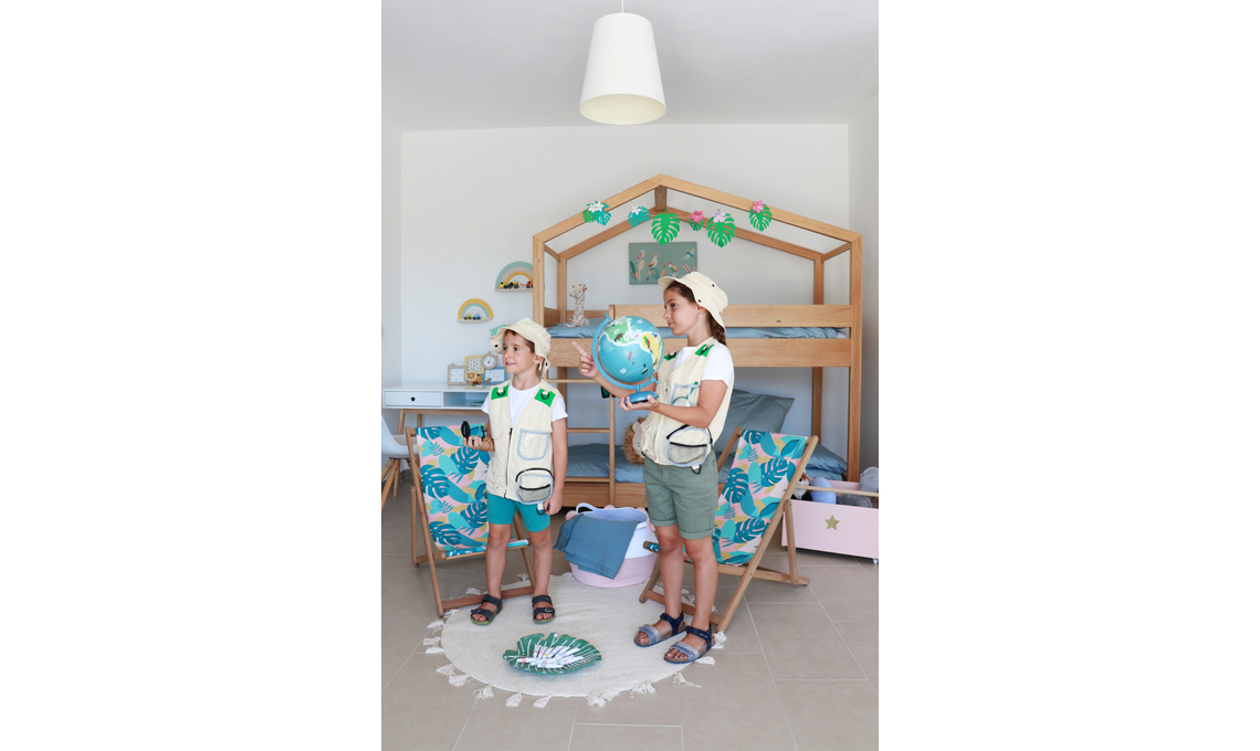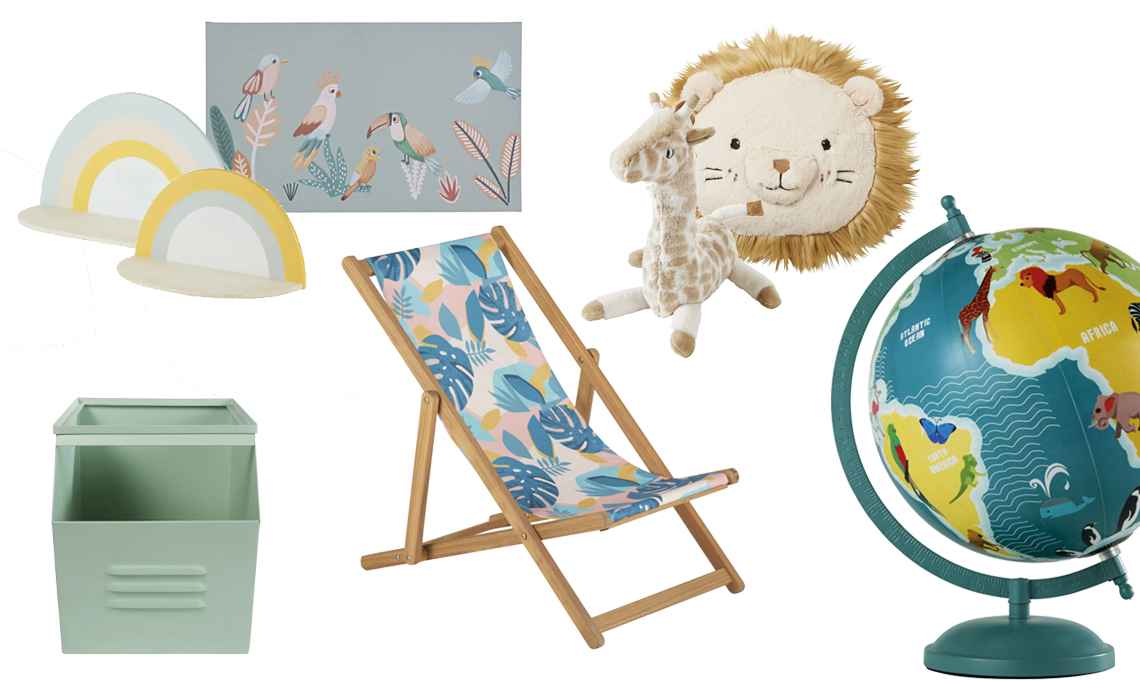 La stanza diventa una giungla con le sdraio Ionna, il cuscino a testa di leone Mini Jungle e la giraffa Olaf, la cassetta porta giocattoli Leo, la mensola arcobaleno Brisbane, la tela disegnata con tanti animali Chamarel. Per decidere in quale parte del mondo giocare c'è Safari, il mappamondo colorato [Maisons du Monde]