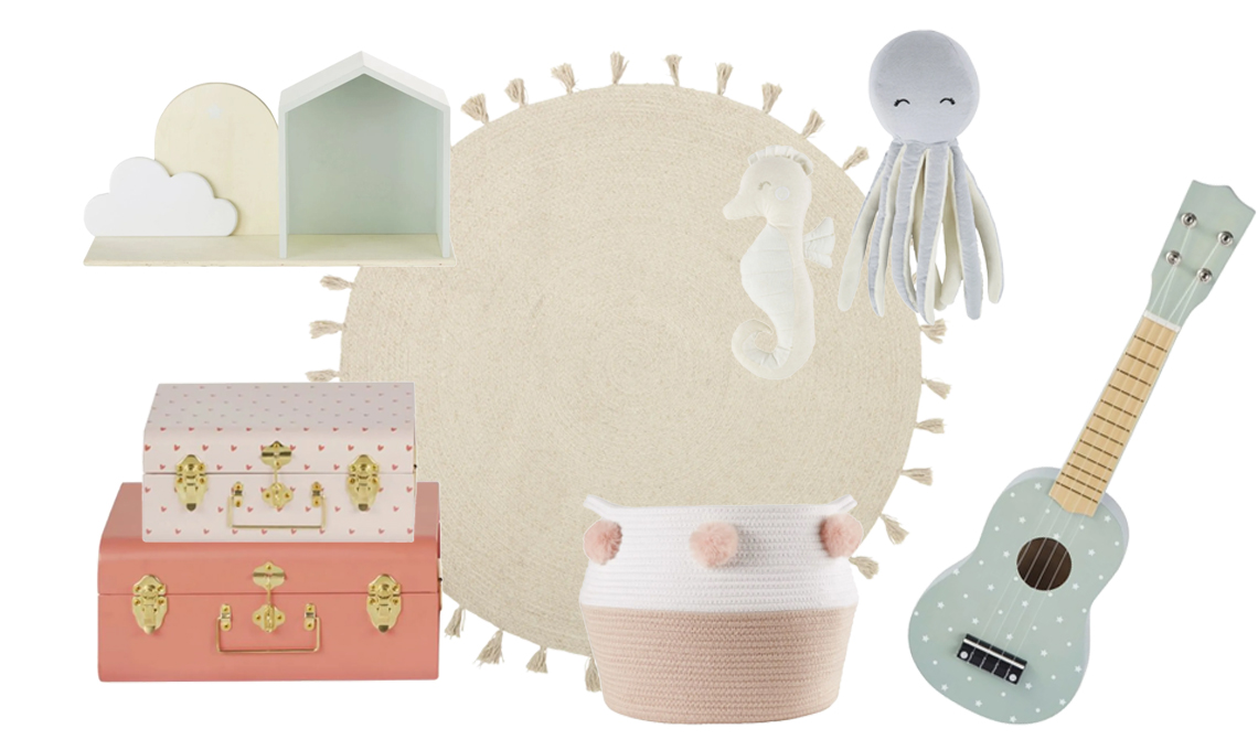 Ambientazione spiaggia: al centro Nina, tappeto rotondo con pompon in cotone écru [€42,99]; in senso orario Orestad, scaffale [€29,99], Chloe, piovra di peluche [€17,99] Alba, ippocampo di peluche [€7,45]; Holly, chitarra blu a pois bianchi [€9,95]; Lila, cesto intrecciato rosa e bianco con pompon [€35,99]; Barsana, set di due bauli in metallo rosa e dorato [€79,99]