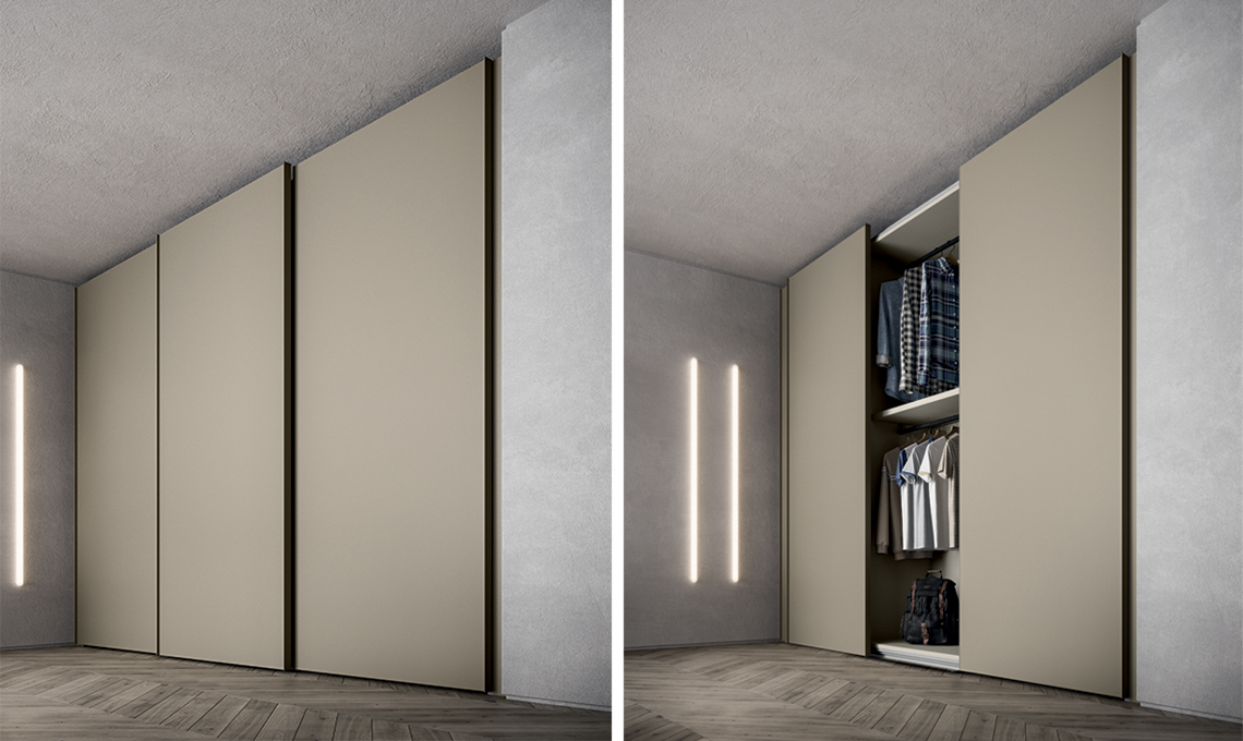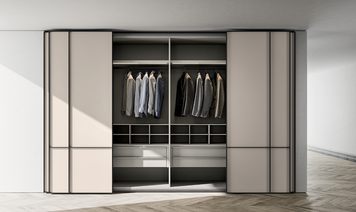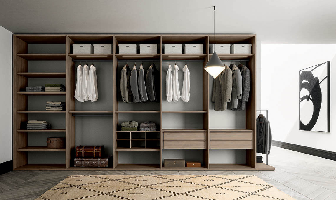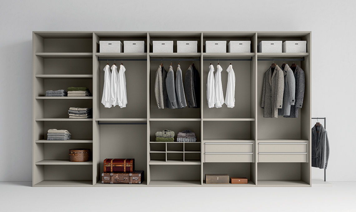 Sia per Alterna che per Free puoi decidere l'organizzazione interna scegliendo tra cassettiere, vani a giorno, ripiani in vetro o legno, appendiabiti, ripiani inclinati portascarpe, ripiani estraibili, vassoi, portapantaloni, accessori per camicie, cinture, cravatte... Addirittura sono Alterna e Free sono attrezzabili con scrittoio interno, specchio orientabile, cesto portabiancheria e asse da stiro.