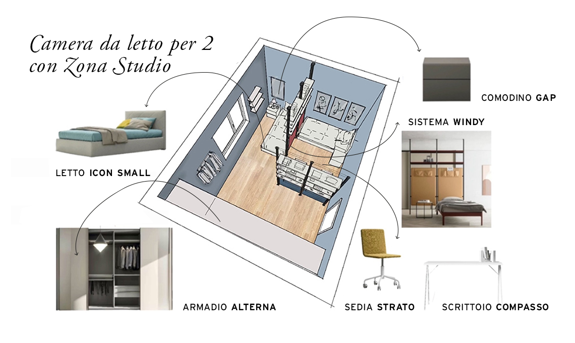 La terza proposta è pensata per una camera per due ragazze/i, i letti singoli vengono disposti ortogonalmente mentre il sistema modulare Windy a soffitto crea una partizione che organizza e divide lo spazio in modo da dare la giusta privacy a ognuno. Qui vengono ricavate anche due scrivanie per la zona studio. La camera viene articolata in diverse zone: una in ingresso comune, dove si trova l'armadio, e due più private adatte al riposo e allo studio.
