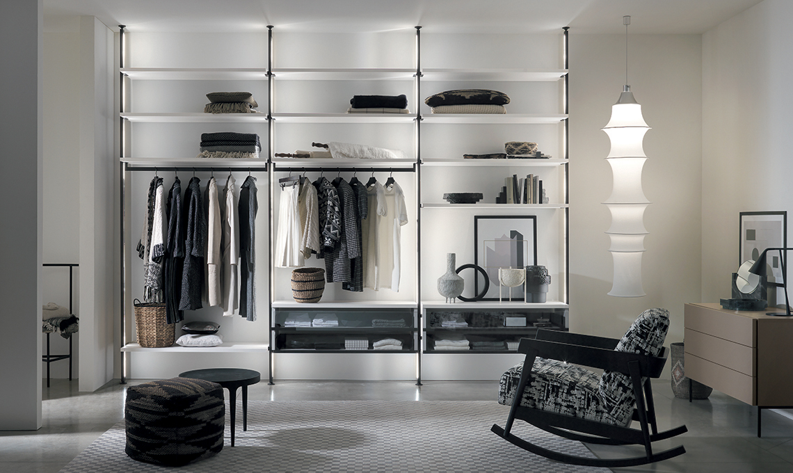 Cabina armadio realizzata con il sistema modulare Windy che lascia libertà di organizzare con vani a giorno o chiusi. Luce a led nel montante della struttura [Zalf].