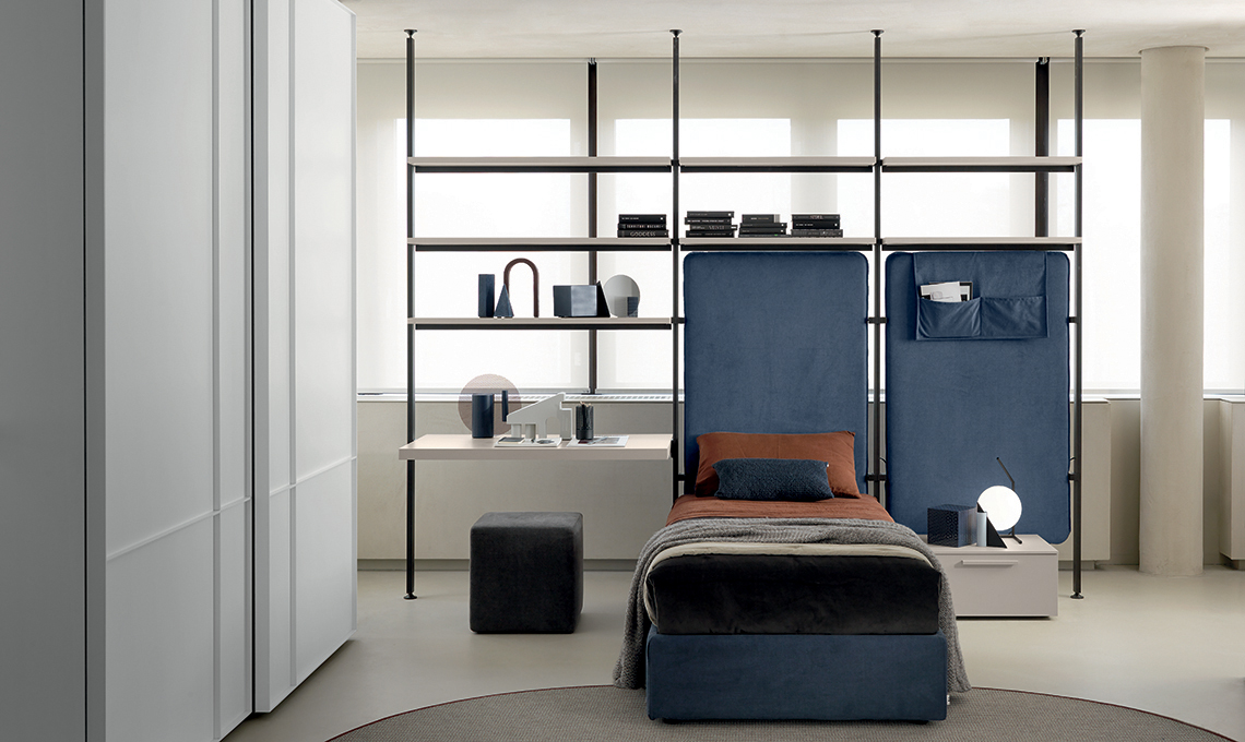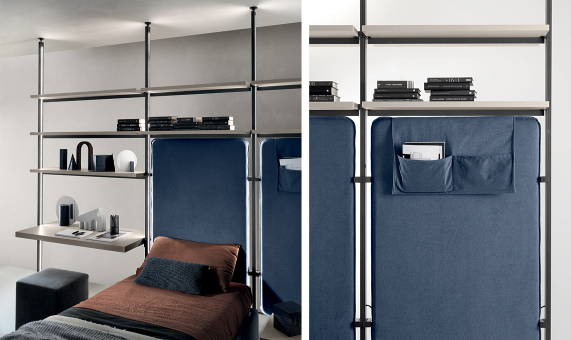 Sistema Windy con palo a soffitto. Il sistema modulare permette di ospitare anche la testata del letto (singolo o matrimoniale) grazie ai pannelli in tessuto Siparium, disponibili in una vasta gamma di colori [Zalf].