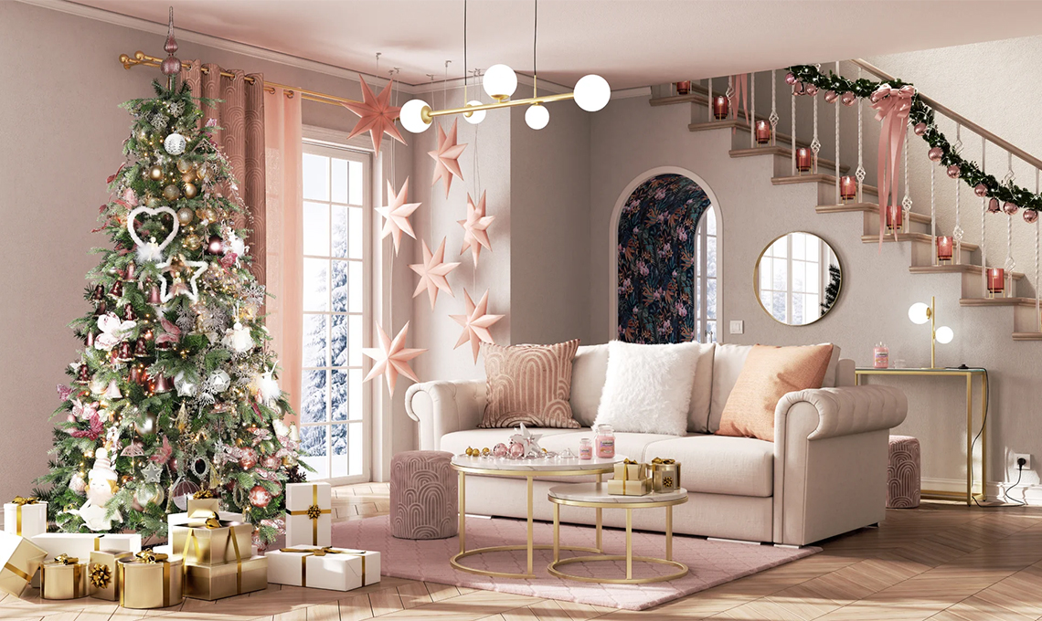 Albero di Natale artificiale Birkdale verde [cm Ø 134x210h, €199,90], set di palline natalizie in pvc multicolore [Ø 8 cm confezione da 100 pezzi, €59.90]. Candela profumata Yankee Candel essenza pink island sunset [cm Ø 9.9x13.5h, € 17,90], cuscino Agate rosa [cm 40x40, €12,99].