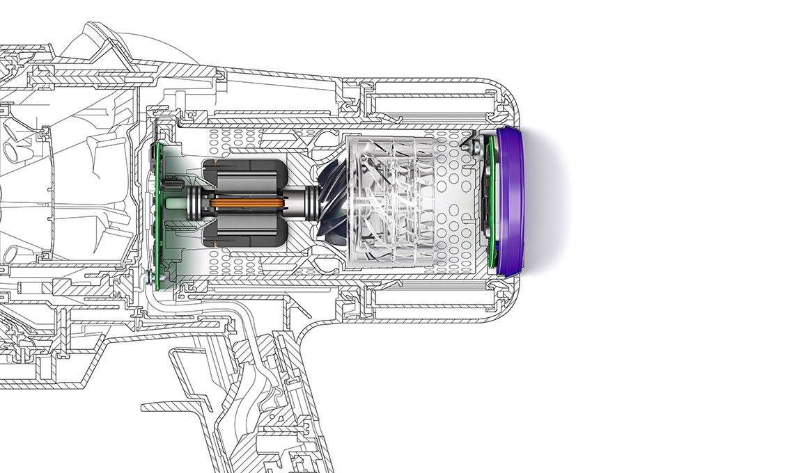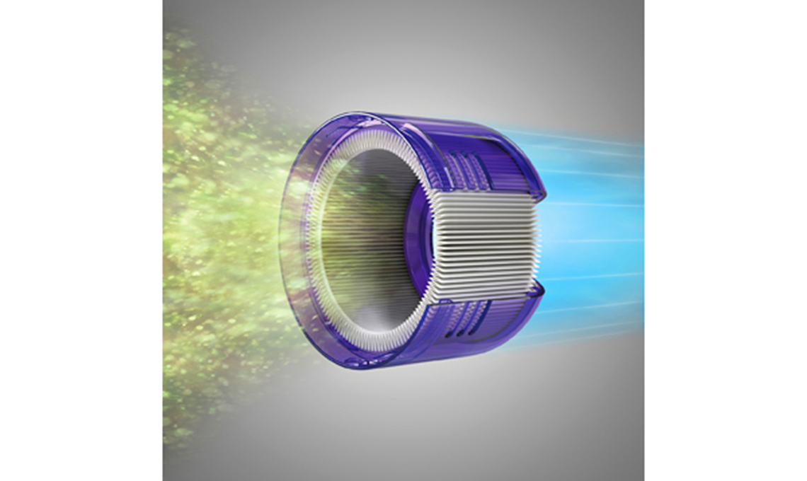 Il filtro a rete metallica garantisce che la rete setacci le particelle dal flusso d'aria. I 14 cicloni generano potenti forze centrifughe, superiore a 79.000 g, che catturano la polvere fine senza perdita di aspirazione. Il filtro pre-motore, caricato elettrostaticamente, attrae le particelle più piccole, catturando nel contenitore anche le particelle microscopiche, come pollini, batteri e acari della polvere.