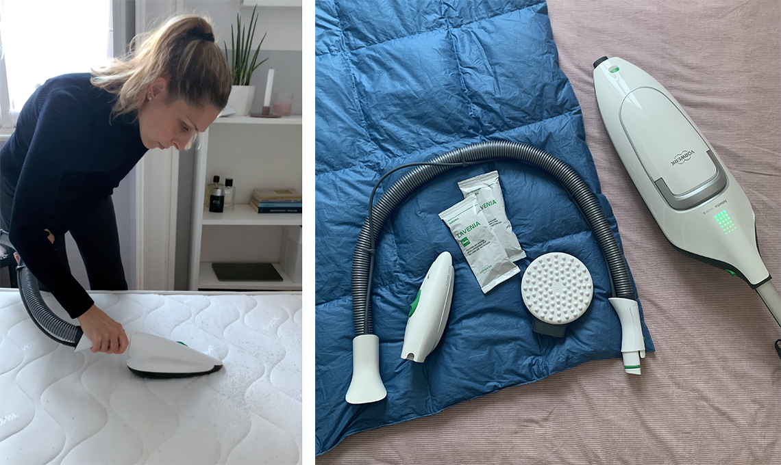 Sostituisco alla spazzola elettrica l’accessorio Battimaterasso e pulisco la superficie. Cospargo il materasso di Lavenia (un detergente ipoallergenico e specifico per la cura di materassi e cuscini) e, inserendo l’accessorio Lavamaterasso, massaggio e faccio penetrare il detergente. Dopo 30 minuti basta eliminare i residui con l’accessorio battimaterasso e gli allergeni saranno solo ricordo.