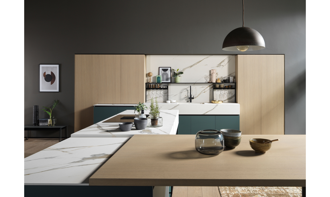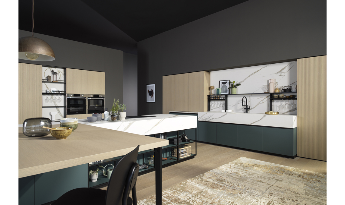 Le maniglie sono tutte in alluminio riciclabile. I top, oltre che in Laminam, acciaio inox e Cosmolite, sono disponibili anche in altri composti ceramici dalle caratteristiche simili, ovvero Abitum, Infinity, Iris e Dekton. Ci sono infine i complementi con struttura in alluminio, come gli Open, gli elementi a giorno Rubik con ripiani in PET o impiallacciato travi, i canali Modus, i canali attrezzati in acciaio e alcuni tavoli.