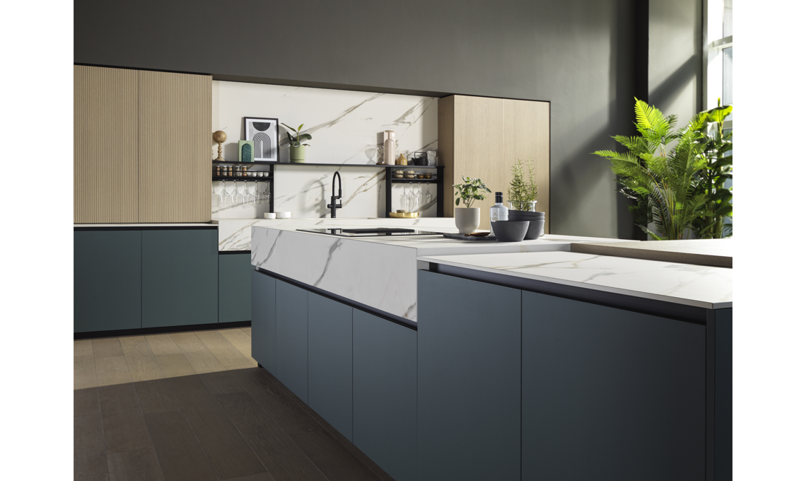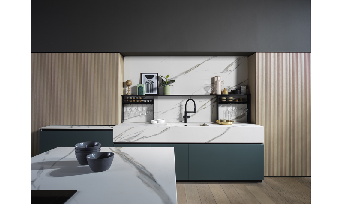 Allestimento Gaia. La zona lavaggio lineare ha un piano dall’alto spessore con lavello integrato in Abitum Calacatta Delicato, stesso materiale usato per lo schienale.