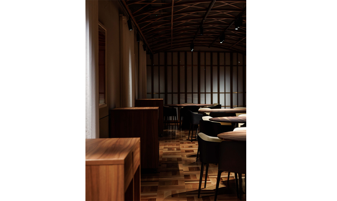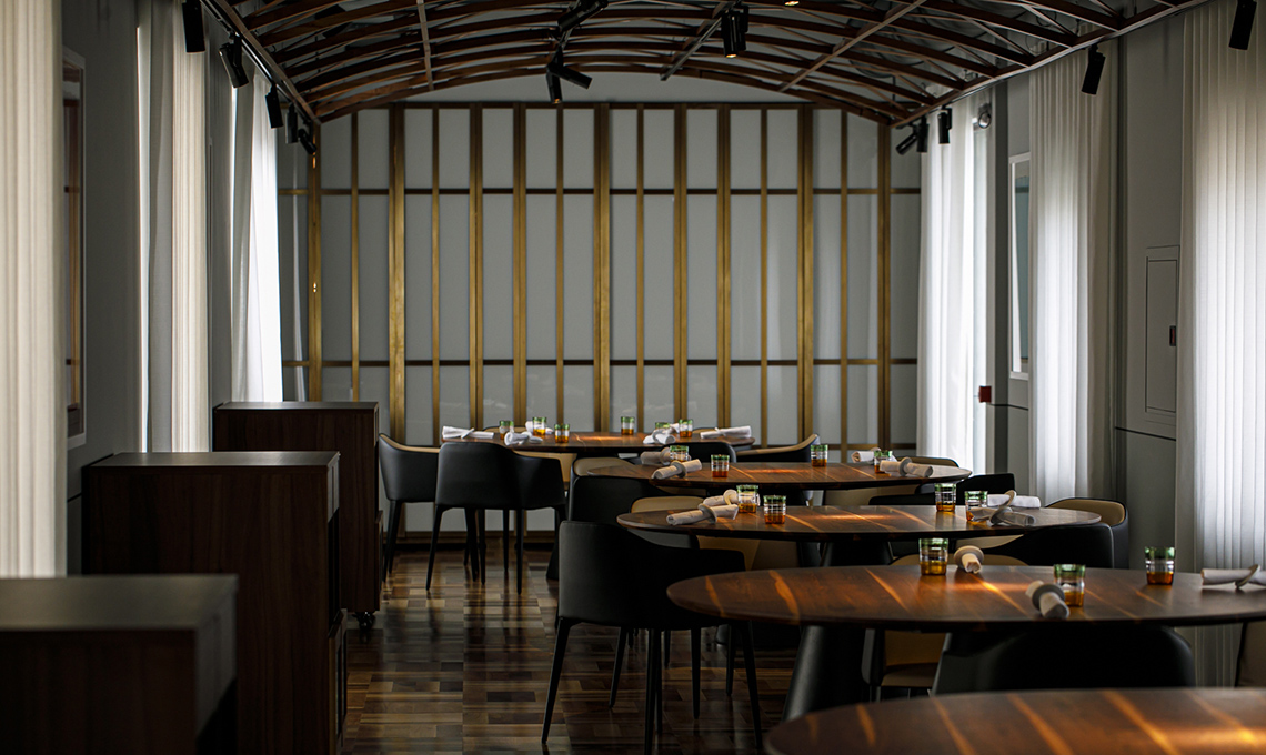 Il concept architettonico pone in particolare rilievo la cucina. Protagonista indiscusso lo chef table rivestito in marmo che consente all’ospite di vivere in maniera diretta e pulsante i sapienti gesti degli chef intenti nella creazione dei piatti. Proprio come guardare attraverso l’obiettivo di una macchina fotografica. Anche la lavorazione degli specchi anticati, sembra voler emulare la grana delle pellicole fotografiche, introducendo negli interni un evidente e ricorrente riferimento materico a questa forma d'arte.