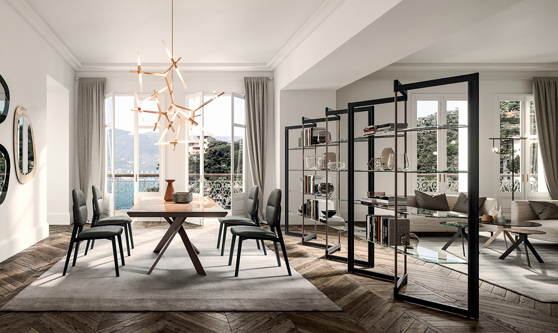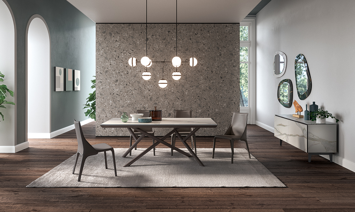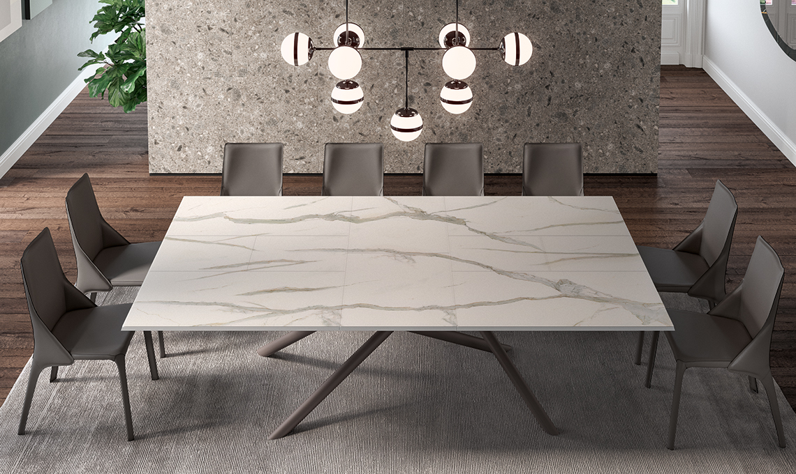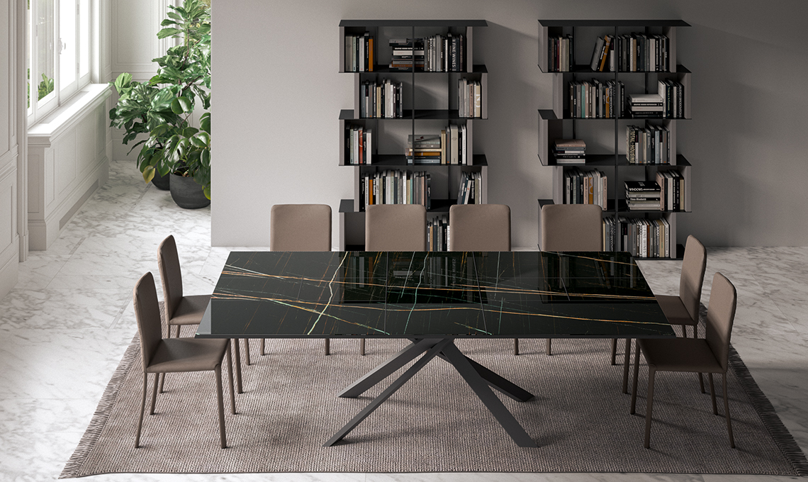 La finitura Marble Glass è realizzata con un vetro temperato serigrafato che riproduce l’effetto di una lastra di marmo. Estetica al top, praticità anche! La venatura della lastra non perde continuità nemmeno nella versione ampliata: una vera finezza per chi ama il tavolo ‘nudo’.