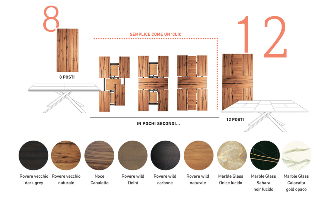 Allungare e allargare il tavolo è facile: le guide del meccanismo studiato dall’architetto progettista Giulio Manzoni sono magnetiche e le allunghe (già ‘nascoste’ sotto il tavolo) si aprono e si agganciano in un attimo! E ci sono tantissime finiture a disposizione, dal legno all'effetto marmo.