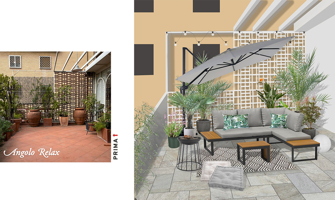 Basta scegliere un divano con cuscini, dal design attuale, che permetta varie configurazioni in base alle tue esigenze oppure un set salvaspazio se hai uno spazio mini. Delimita la zona con un tappeto da esterno e aggiungi tante piante verdi e fiorite.