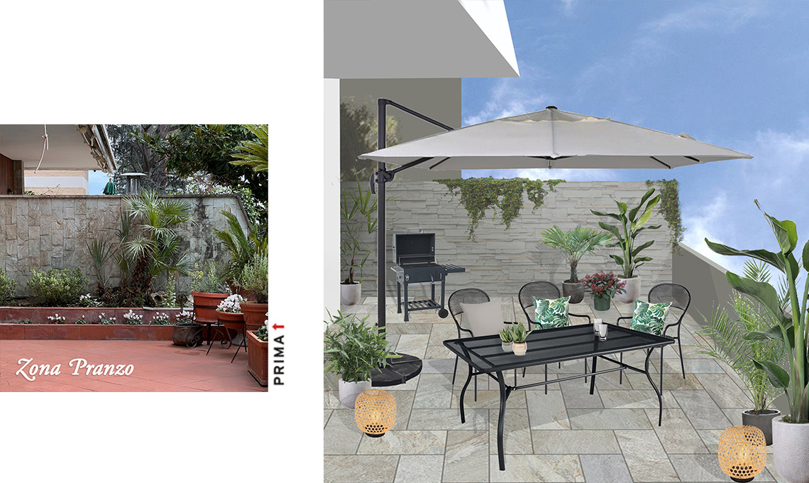 Ho scelto un set con divano angolare, tappeto, braciere e poi cuscini e piante di ogni tipo per l'area salotto. Mentre per l'angolo pranzo sono rimasta colpita da tavolo e sedie in ferro color antracite e ho arricchito l’ambiente con cuscini, piante, lanterne e barbecue… immancabile negli spazi outdoor di un’argentina come me! Naturalmente, per garantire fresco e ombra ho scelto anche un ombrellone a braccio perfetto per il mio terrazzo.