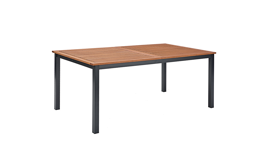 Tavolo allungabile serie Orsi. Dim: cm 180/240x89 con sistema di apertura butterfly. Materiale: alluminio ed eucalipto € 569 (completo di 6 sedie).