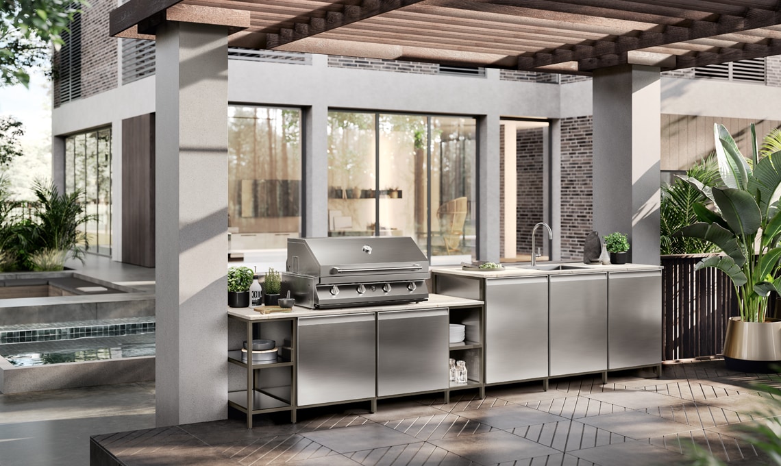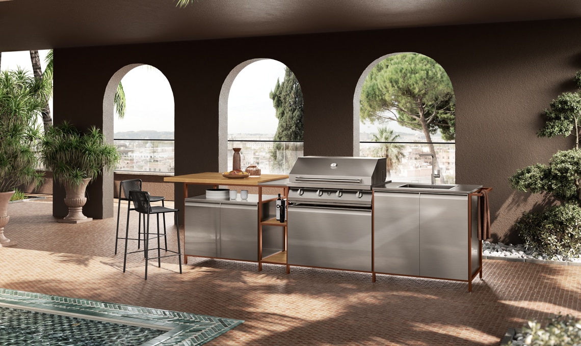 La possibilità di integrare elementi ribassati o a giorno permette di creare un gioco di simmetrie che dà vita ad architetture multifunzionali dalle forme rigorose. Il risultato è una cucina estremamente funzionale, capace di dialogare armoniosamente con lo sfondo e il contesto naturale in cui è inserita. Gli elementi tra cui scegliere sono 19 e si possono abbinare a elettrodomestici di ultima generazione, consentendo di creare una configurazione unica ed esclusiva, adattabile a qualsiasi spazio all'aperto e stile di arredamento.
