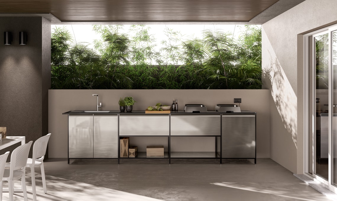 Formalia Outdoor [Scavolini] - Sistema Parete Status con finitura Titanio; anta e profilo maniglia in Acciaio; piano Quarz Verde Magnolia finitura opaca