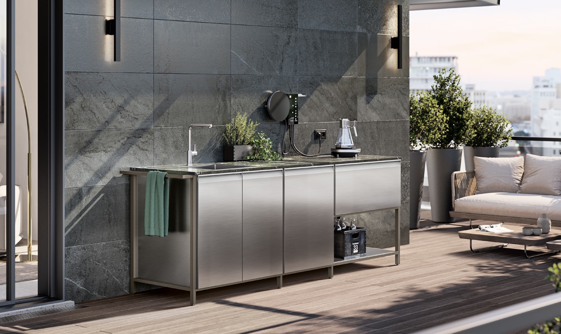 La struttura in alluminio e il top con zona lavaggio integrata sono disponibili sia in acciaio che in altri materiali attentamente selezionati. Le ante possono essere scelte in acciaio per un look tecnico e raffinato oppure in legno per esterni, come il multistrato di Okumè nobilitato in essenza teak, che conferisce un aspetto più materico all'insieme. Entrambe le soluzioni sono estremamente resistenti all'umidità, alle intemperie, agli sbalzi termici e all'usura.
