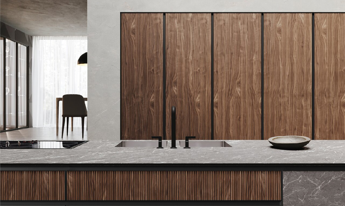 La texture del legno e la lavorazione rigata del Noce Canaletto sono ancora più enfatizzate nelle colonne con sistema di apertura a gola verticale, dove le grandi ante, che alloggiano al loro interno anche i grandi elettrodomestici, creano un effetto di sfondo continuo.