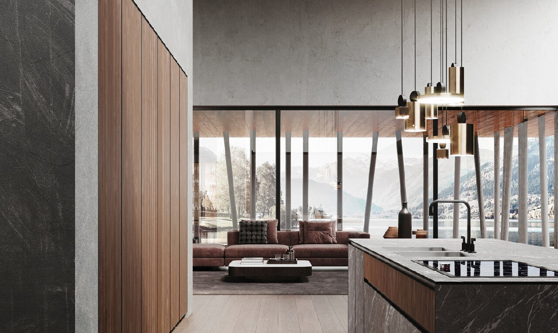 La protagonista dell’ambiente qui è l’ampia isola della cucina: le ante hanno un telaio in alluminio nero che incornicia un elegante pannello in HPL pietra Alicante.