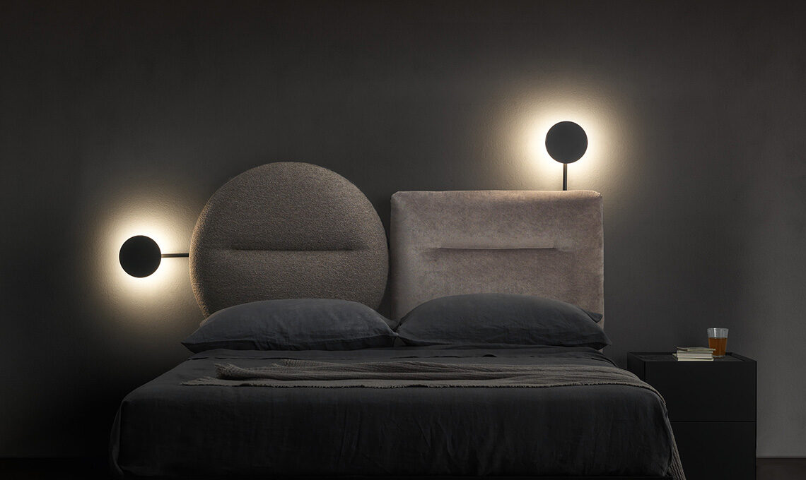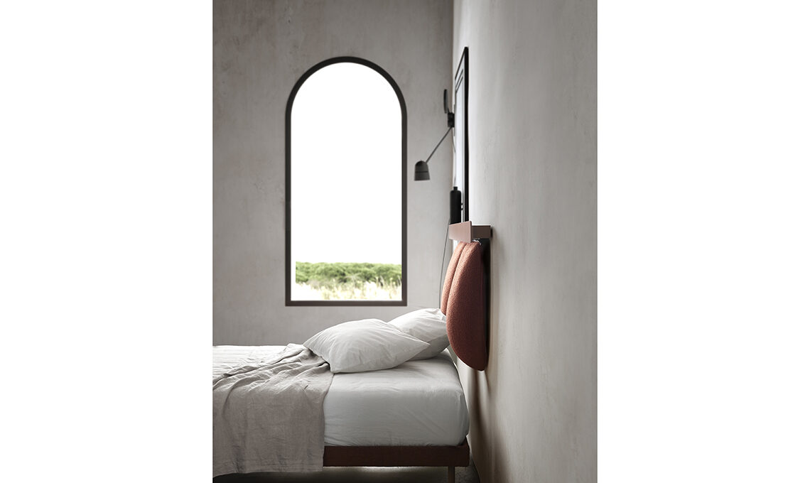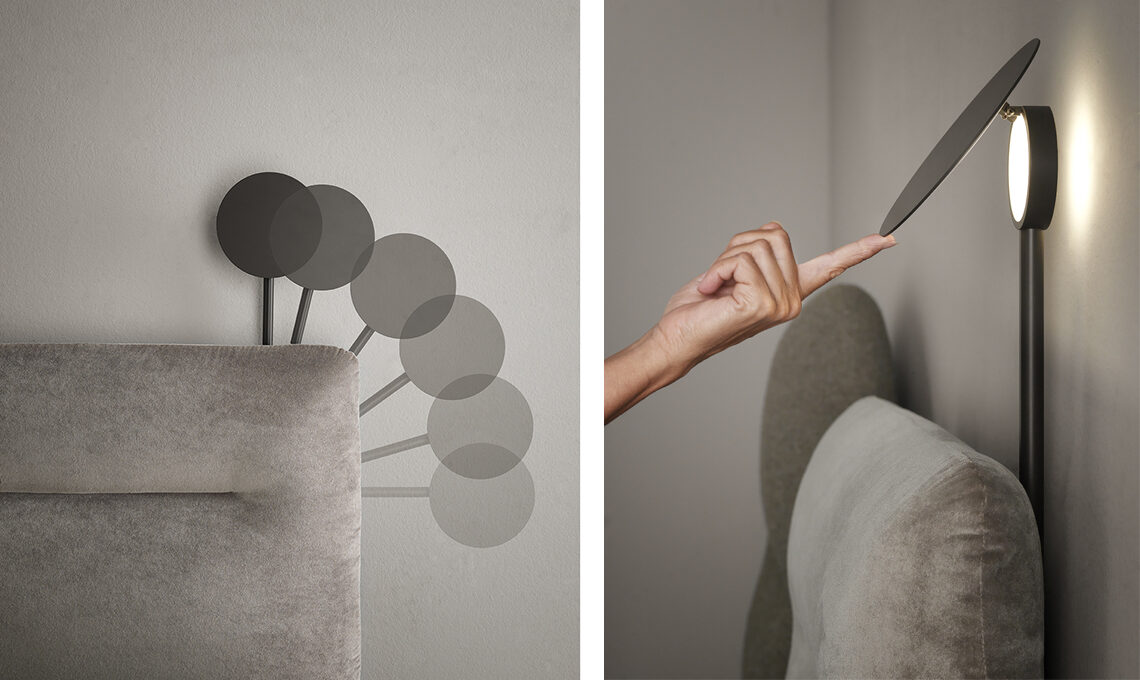 Il movimentato profilo di Bishape assume ancora più forza con l’applicazione, ai lati, di un originale supporto luci che può essere laccato in tutti i colori della palette Caccaro. Grazie ad un innovativo meccanismo ideato dall’R&D dell’azienda, incassato sul retro della testiera, i supporti ruotano di un angolo variabile che arriva sino a 90°. Il movimento è particolarmente fluido e silenzioso, si innesca con la leggera spinta di un dito e si blocca automaticamente quando si interrompe la spinta. Il paralume rotondo può essere sollevato per direzionare la luce dove serve.