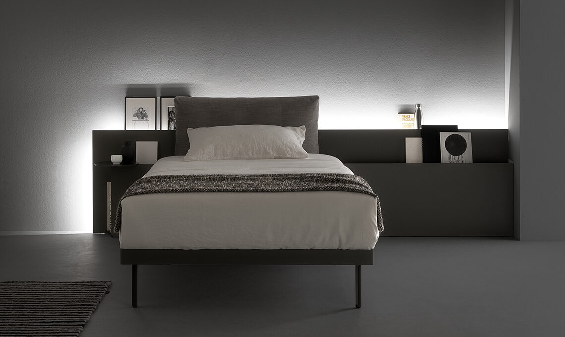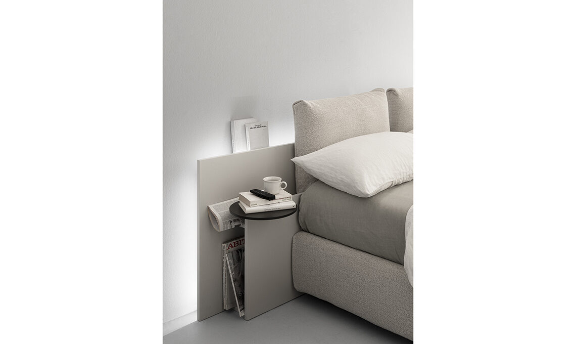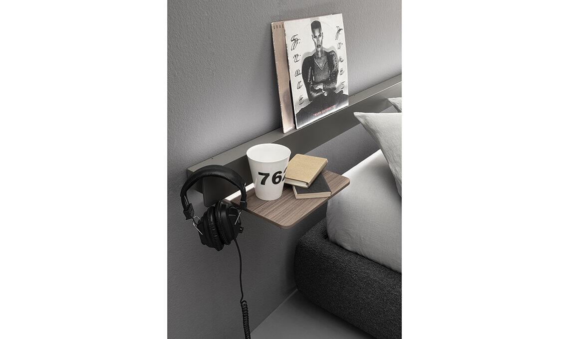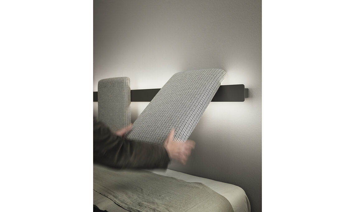 Let’space (Design Caccaro) è un letto che esalta la sartorialità, punto di forza dell'azienda. La testiera può spaziare sulla parete: da angolo ad angolo (in nicchia) o in una posizione più libera al centro della stessa. Può diventare una boiserie che offre, in tutta la sua lunghezza, un vano profondo 13 cm su cui appoggiare fotografie, libri, riviste e molto altro. Sul retro della testiera è possibile installare una schiena luminosa che diffonde una morbida luce ambientale. Un tavolino laccato orientabile può essere applicato ai lati per offrire un’ulteriore comoda superficie d’appoggio.