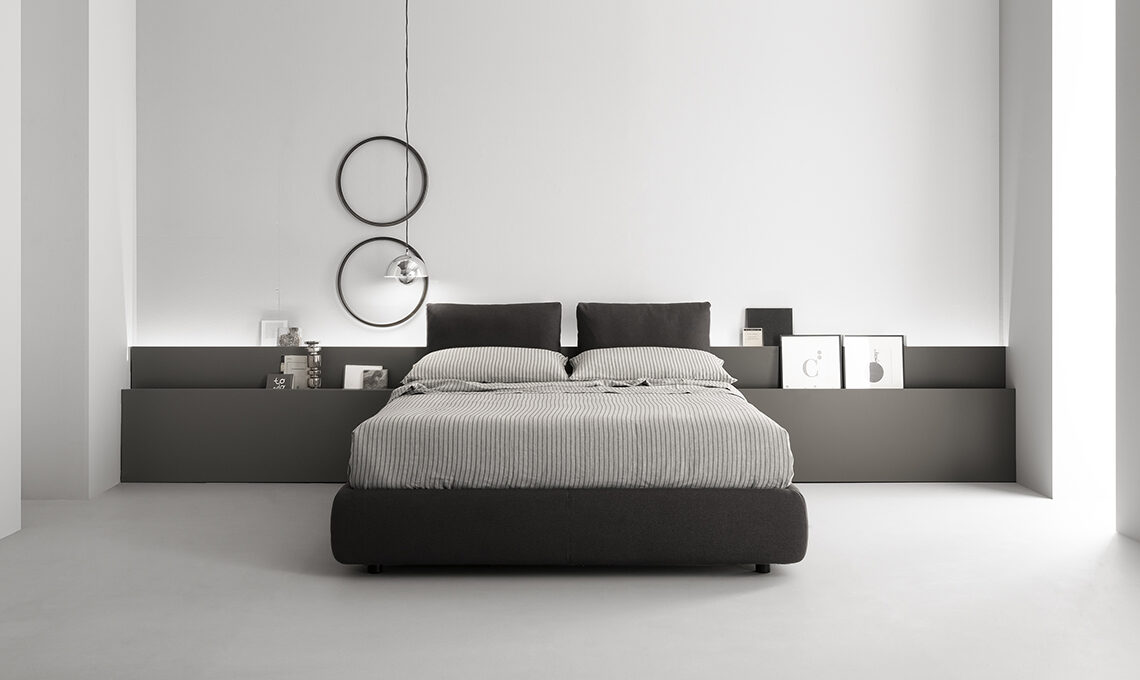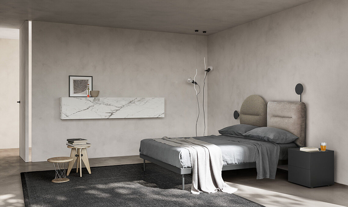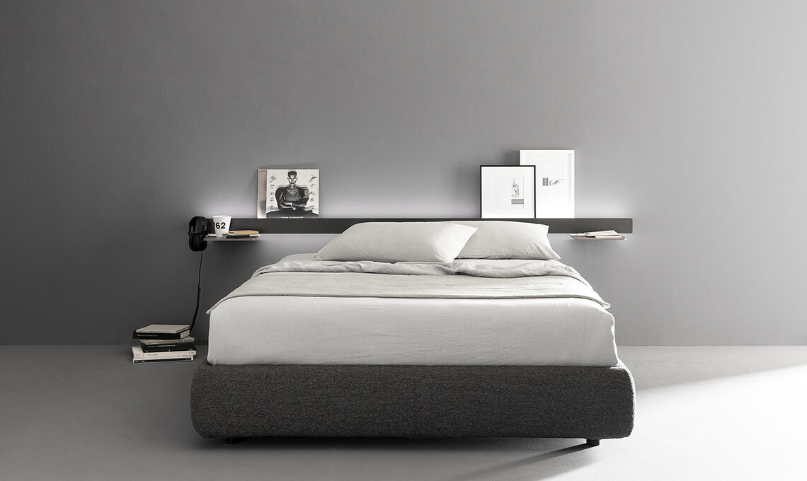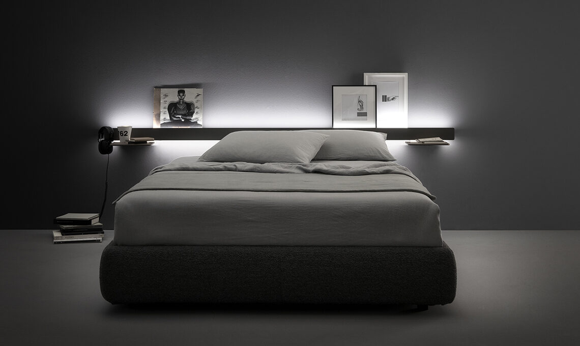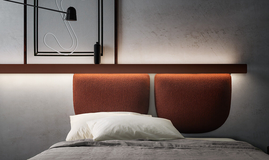 Let’space (Design Caccaro) è un letto che esalta la sartorialità, punto di forza dell'azienda. La testiera può spaziare sulla parete: da angolo ad angolo (in nicchia) o in una posizione più libera al centro della stessa. Può diventare una boiserie che offre, in tutta la sua lunghezza, un vano profondo 13 cm su cui appoggiare fotografie, libri, riviste e molto altro. Sul retro della testiera è possibile installare una schiena luminosa che diffonde una morbida luce ambientale. Un tavolino laccato orientabile può essere applicato ai lati per offrire un’ulteriore comoda superficie d’appoggio.