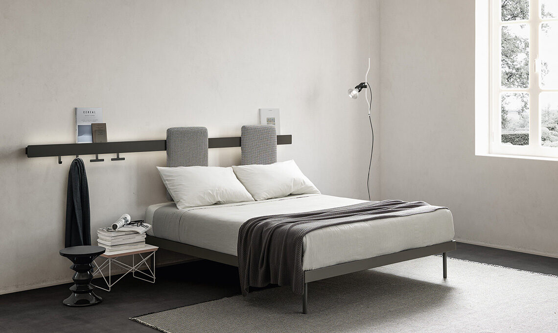Groove (design Monica Graffeo) è un inno alla destrutturazione del letto. Groove è infatti la barra multifunzione in alluminio che può fungere anche da testiera. Altezza di fissaggio sul muro, accessori e abbinamenti con il giroletto creano soluzioni sempre nuove.