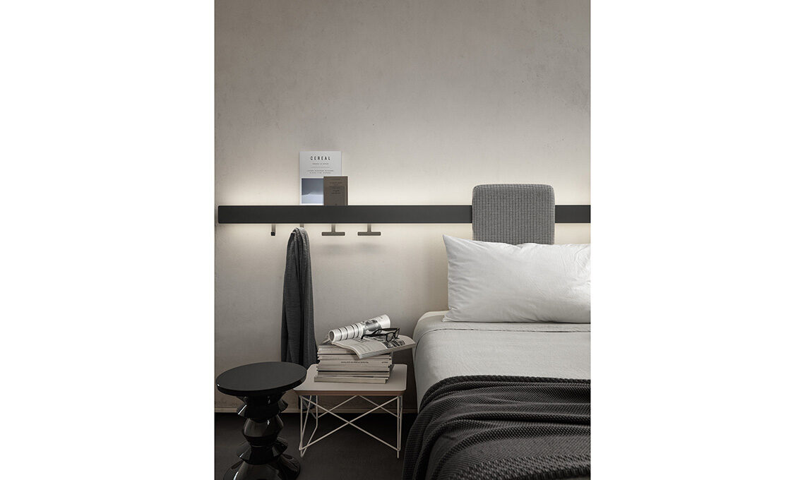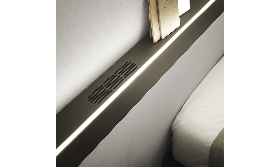 La barra Groove può rivelarsi una comoda mensola su cui appoggiare gli oggetti da tenere accanto nello spazio del riposo e diventare un’ulteriore fonte di illuminazione per la zona notte. È possibile attrezzarla con due barre LED, nella parte superiore e nella parte inferiore, per diffondere una luce morbida che gioca delicatamente con la superficie della parete. Grazie a quattro amplificatori stereo bluetooth, si collega con grande semplicità a tablet e smartphone.