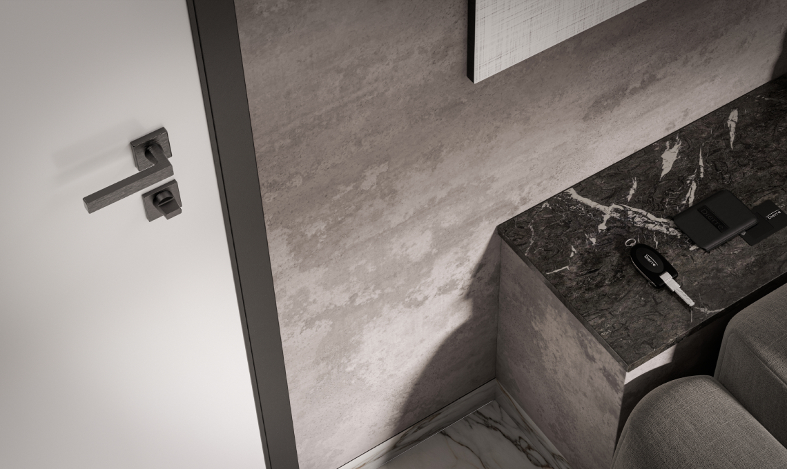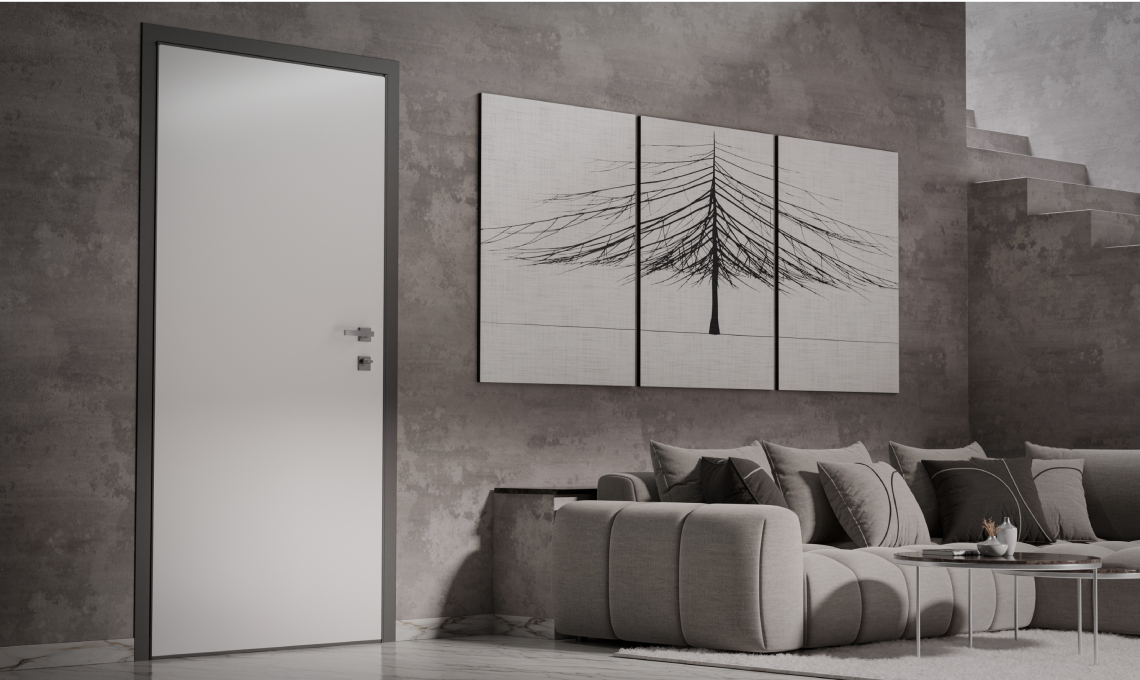 Una porta blindata dall’estetica minimalista ma ricercata: telaio, carenatura e controtelaio disegnano una cornice grigio micaceo che ben si abbina ai pannelli bianchi o grigi per un risultato equilibrato e sobrio. Completa il tutto la maniglieria in finitura grigio antracite.
