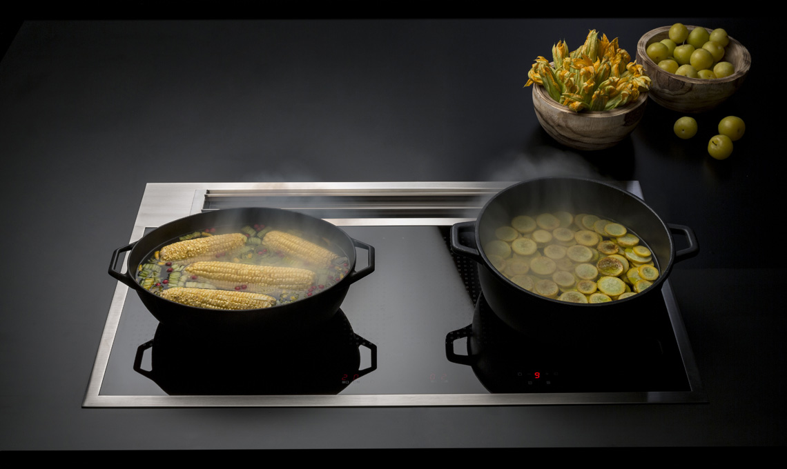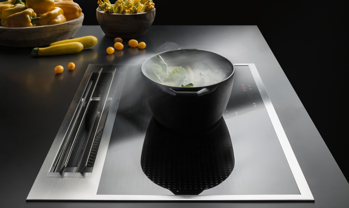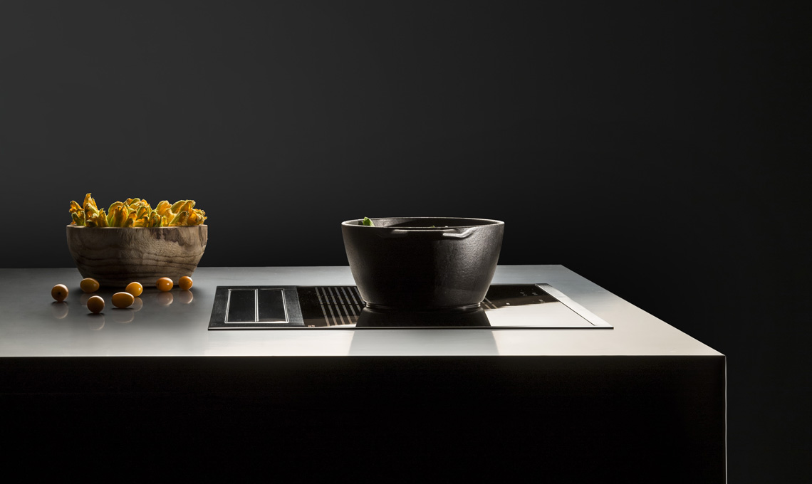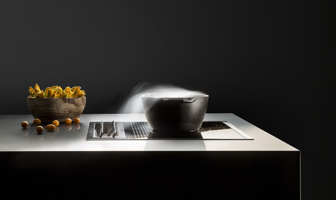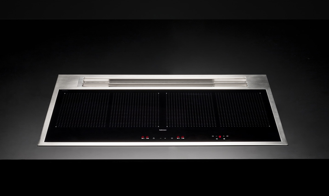 I fumi e i vapori d'ora in poi non salgono verso la cappa, ma scendono dentro la cappa: l'apparato aspirante, infatti, è posto in verticale nella parte posteriore seguendo la larghezza del piano cottura ed è costituito da flap che si aprono automaticamente non appena si inizia a cucinare. Quando il piano cottura non è in funzione i flap si richiudono e scompaiono integrandosi con il piano cottura senza creare spessori visibili che ne comprometterebbero l'eleganza e anche la praticità nella pulizia.