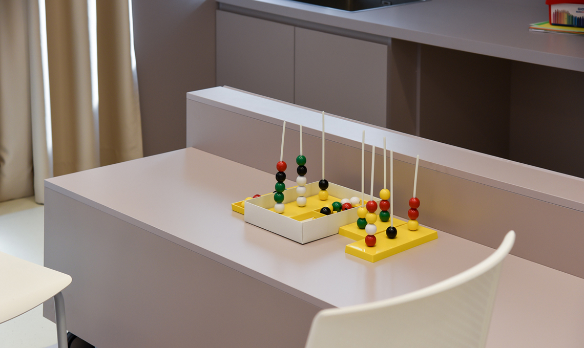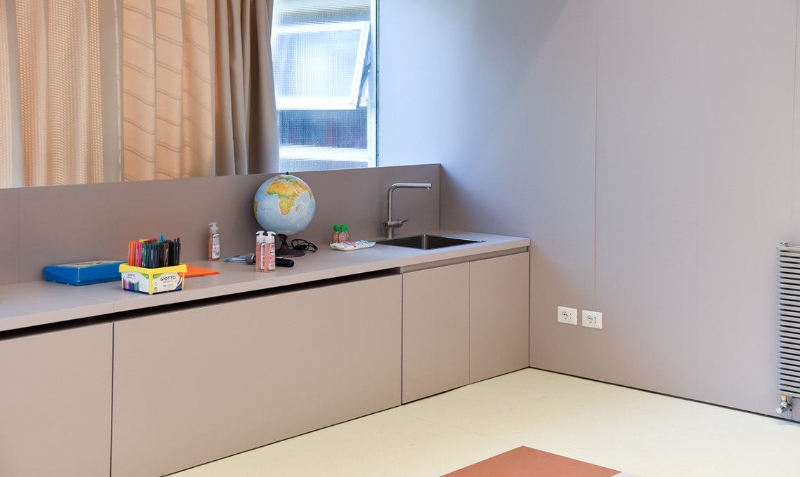 Per le superfici è stato scelto il laminato [Abet Laminati] per le sue qualità funzionali ed estetiche, resistente all'usura e facile da pulire; l'impianto di sanificazione è di [Microsan].