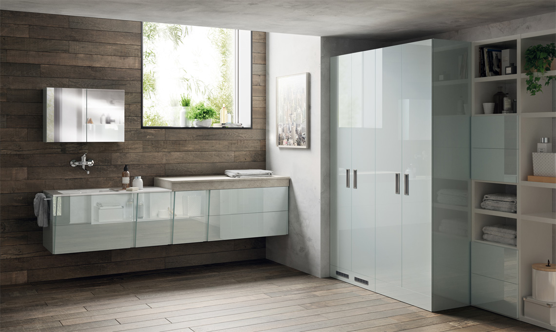 Il progetto può essere abbinato al sistema parete “Fluida” di Scavolini, un sistema modulare a spalla portante che sfrutta profondità, vani configurabili e sviluppo in linea o ad angolo, permettendo di realizzare spazi guardaroba personalizzati, all’insegna della massima funzionalità.