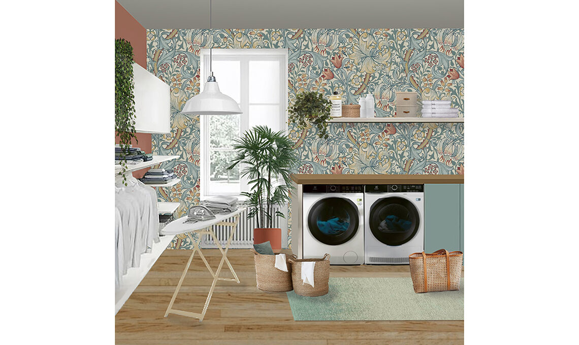 Partendo dalla moodboard di stile abbiamo deciso di creare un'angolo stireria e uno dedicato alla lavanderia vera e propria. Grazie a un lungo piano di appoggio, comodo per piegare i panni, ho finalmente trovato posto per lavatrice e asciugatrice.