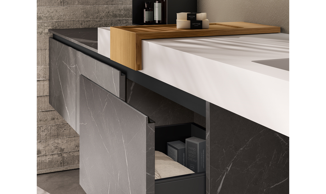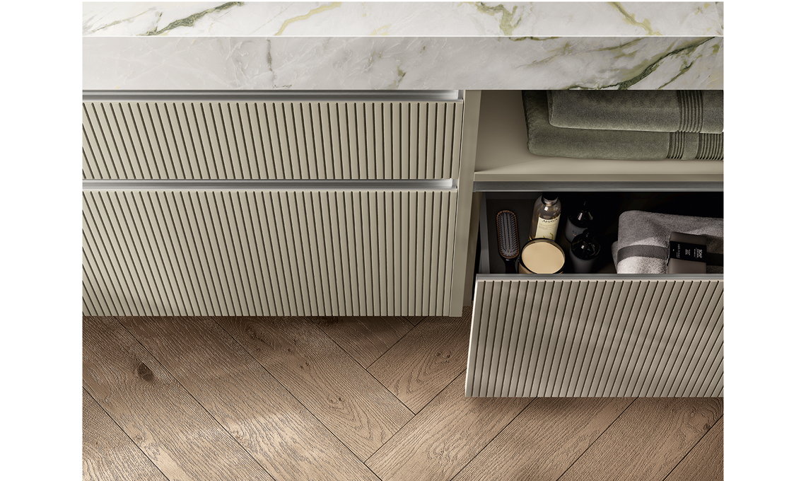 Un dettaglio del bagno Miko [Scavolini]: il profilo maniglia e la gola Flat; piano in Ocritech® Bianco opaco con lavabo integrato Plaza e vassoio scorrevole Useful in Rovere