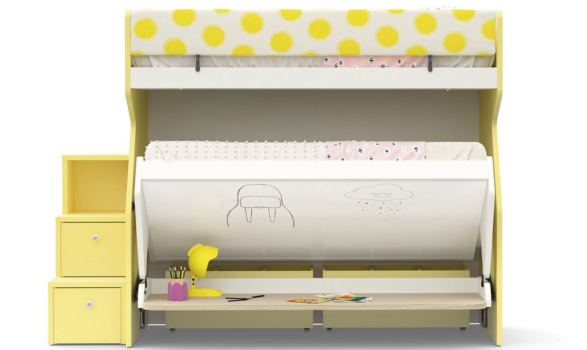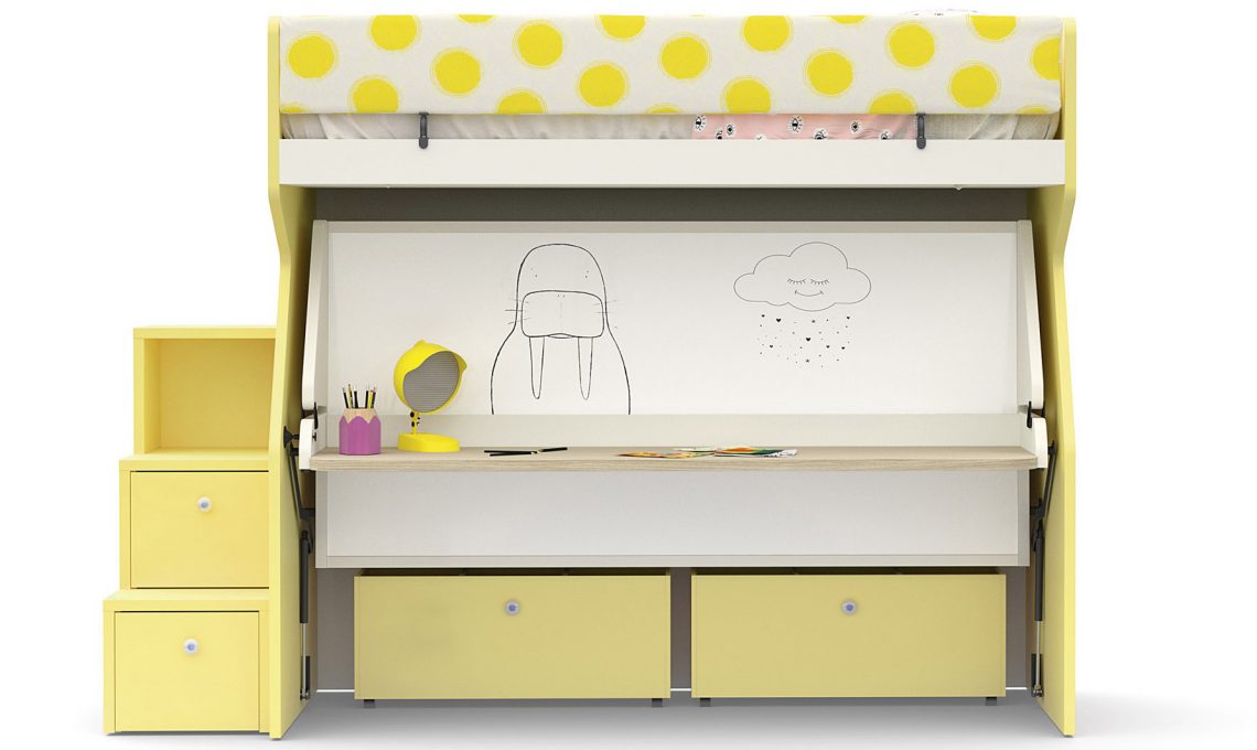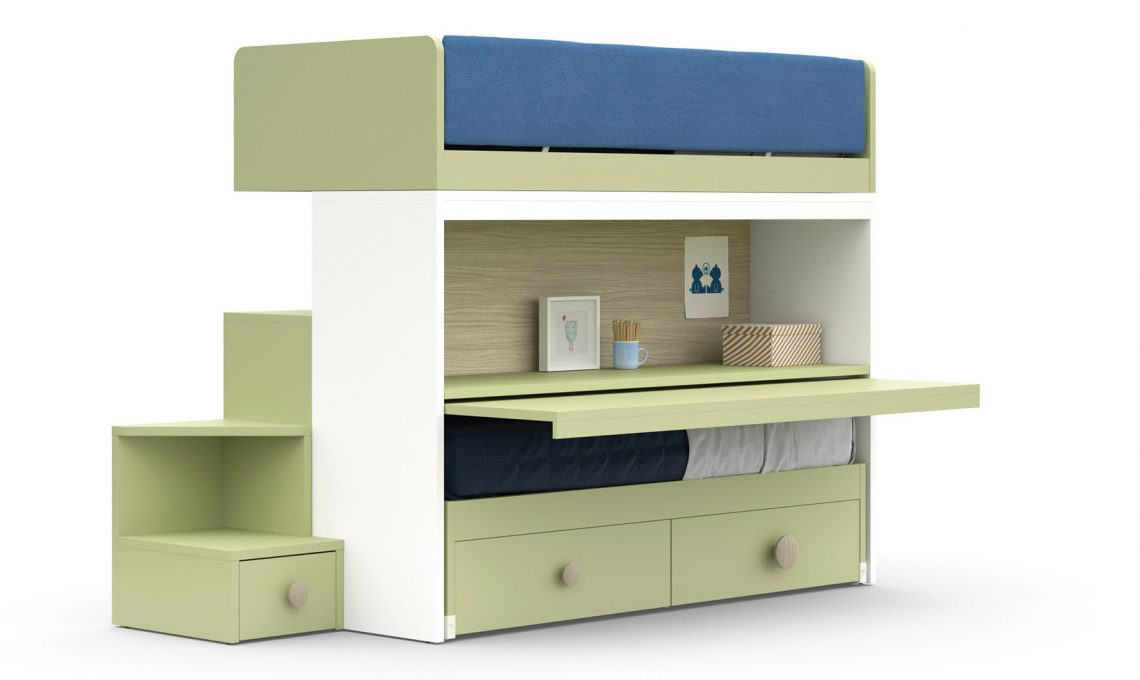 Per una soluzione tre in uno, invece, c'è il letto a castello scorrevole Skid, bello e compatto. Il letto superiore si raggiunge percorrendo una coloratissima pedana, ma di giorno il letto stesso scorre a coprire i gradini e all'occorrenza si possono estrarre il secondo letto o lo scrittoio.