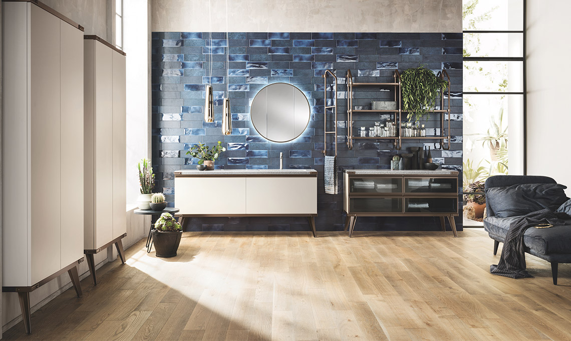 Lo stesso spirito caratterizza l'ambiente bagno: anche qui il sistema di scaffalature componibili Stock Rack esprime lo stile industrial e consente l'inserimento di mensole, vani a giorno, pensili e basi di diverse misure, a terra e sospese. La presa maniglia è anche in questo caso montata sulla testa dell'anta, mentre i lavabi in appoggio di forma rotonda o rettangolare dal design esclusivo vengono proposti in Mineralmarmo bianco e in marmo in diverse finiture. Un'ulteriore personalizzazione viene dalle specchiere, importanti elementi d'arredo.