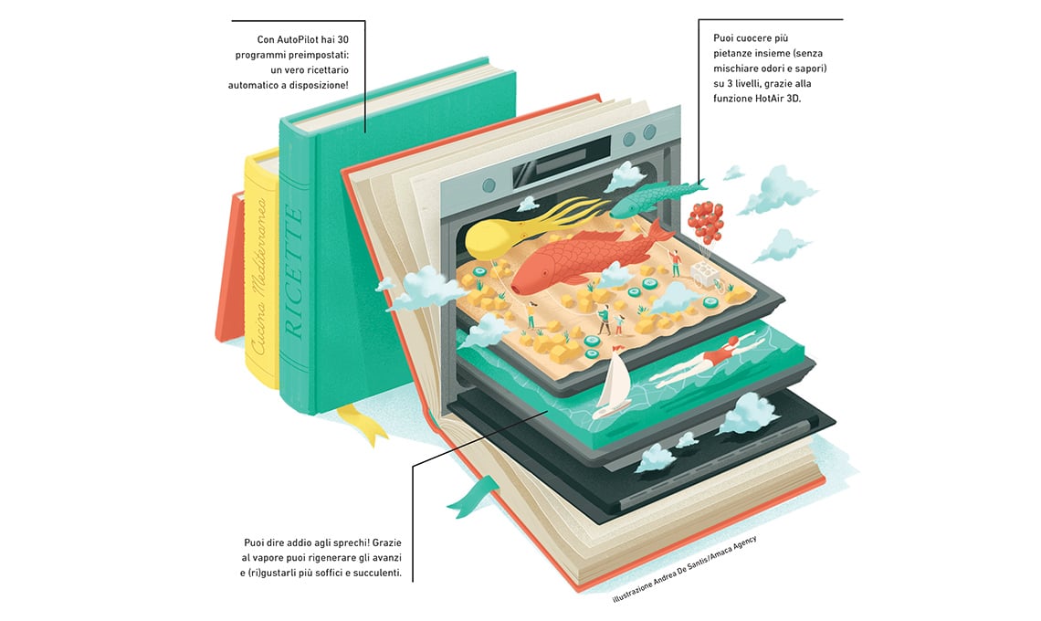 Un ricettario che si apre... e diventa un forno dalle mille sorprese è opera di Andrea De Santis, (su Instagram: @andreadesantisillustrator).