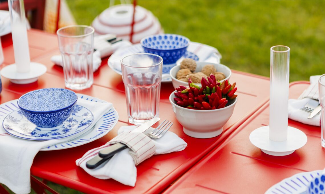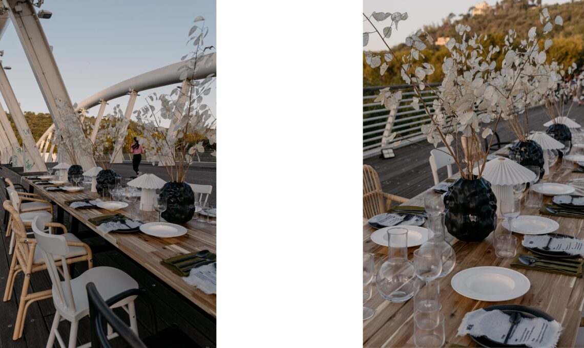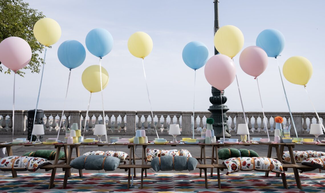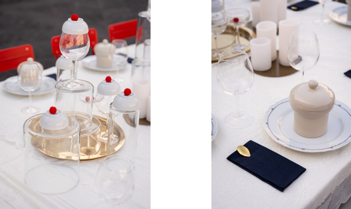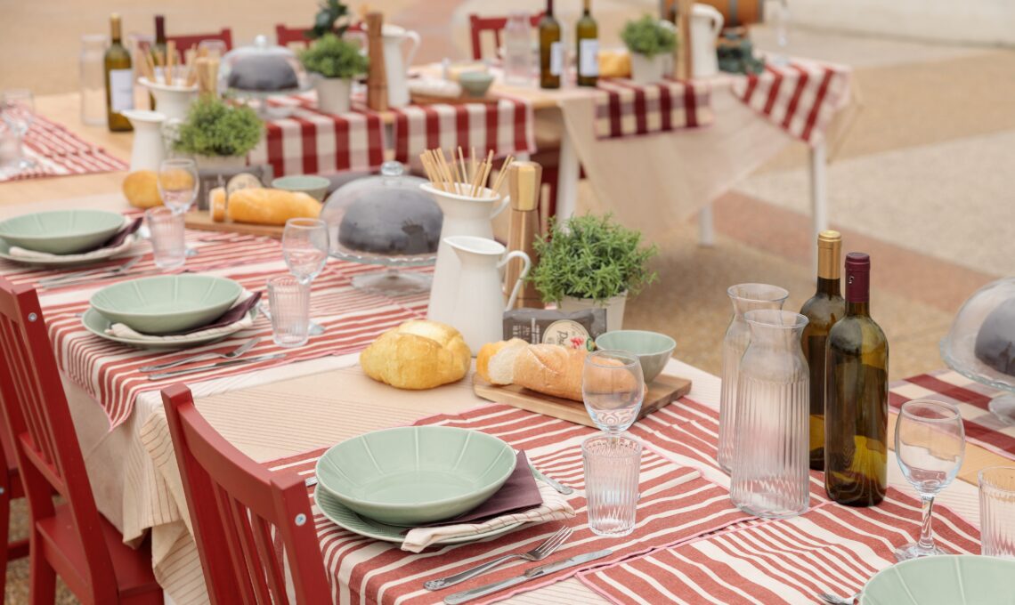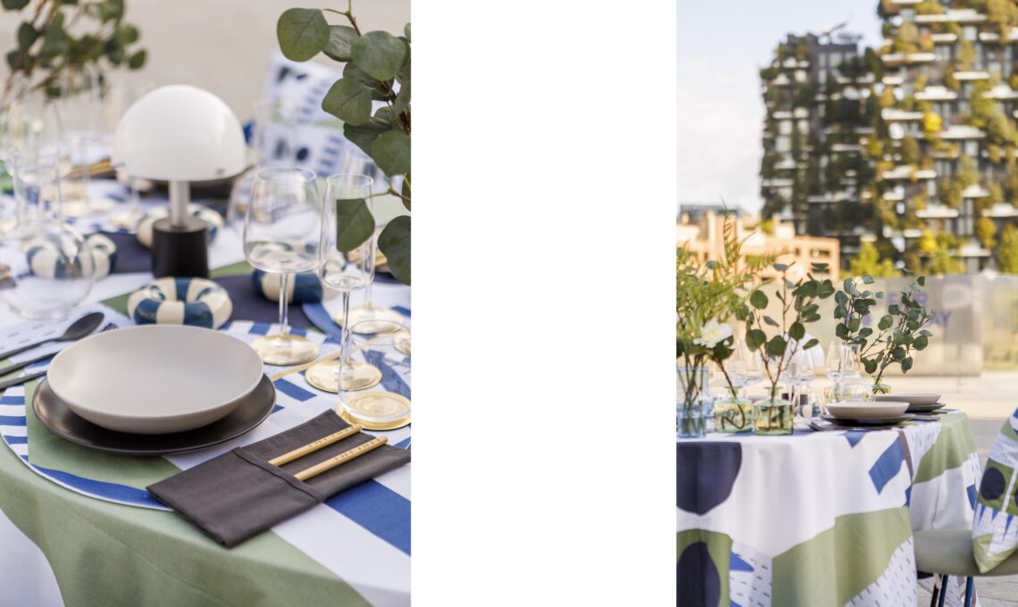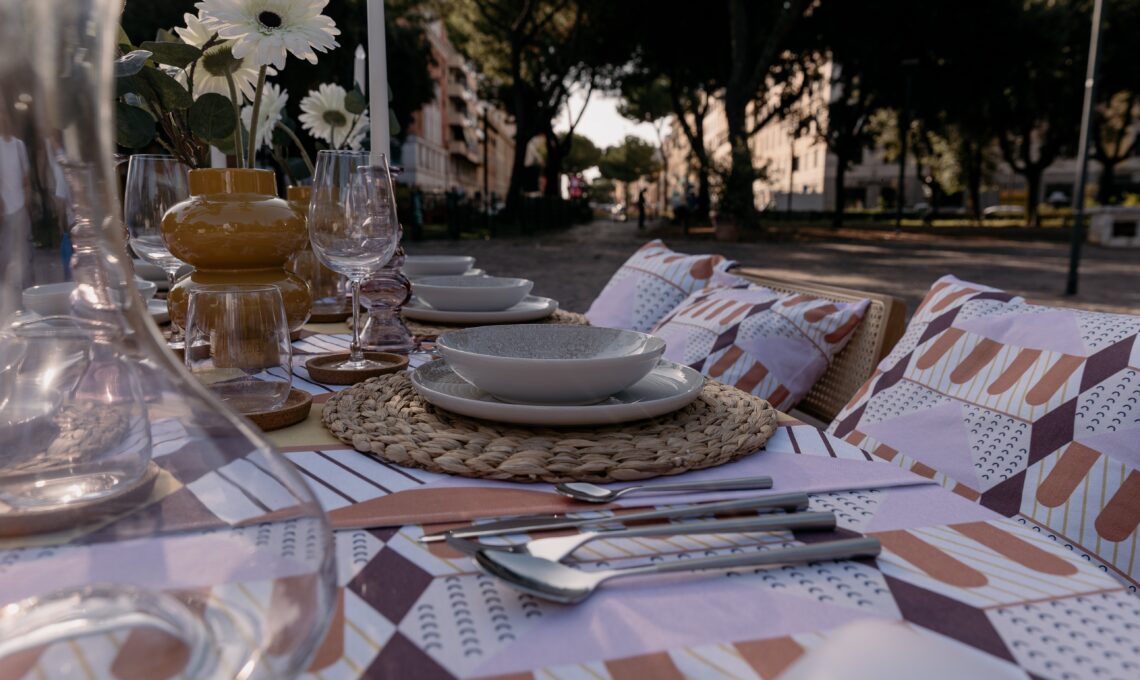 La tavola si frammenta in piccoli tavolini, ciascuno apparecchiato con piatti colorati, sgabelli leggeri, bicchieri di vetro e runner dai motivi vivaci che ricordano i colori della città.