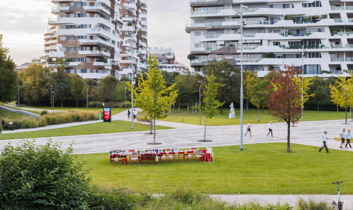 Nel cuore di CityLife, simbolo della Milano contemporanea, un lungo tavolo attraversa lo spazio come una linea di connessione tra persone, culture e storie. Le cassette di frutta e ortaggi richiamano la terra, il lavoro condiviso, la semplicità del gesto quotidiano. In un contesto urbano proiettato verso il futuro, l’installazione riporta l’attenzione sulla dimensione umana e comunitaria del vivere insieme.