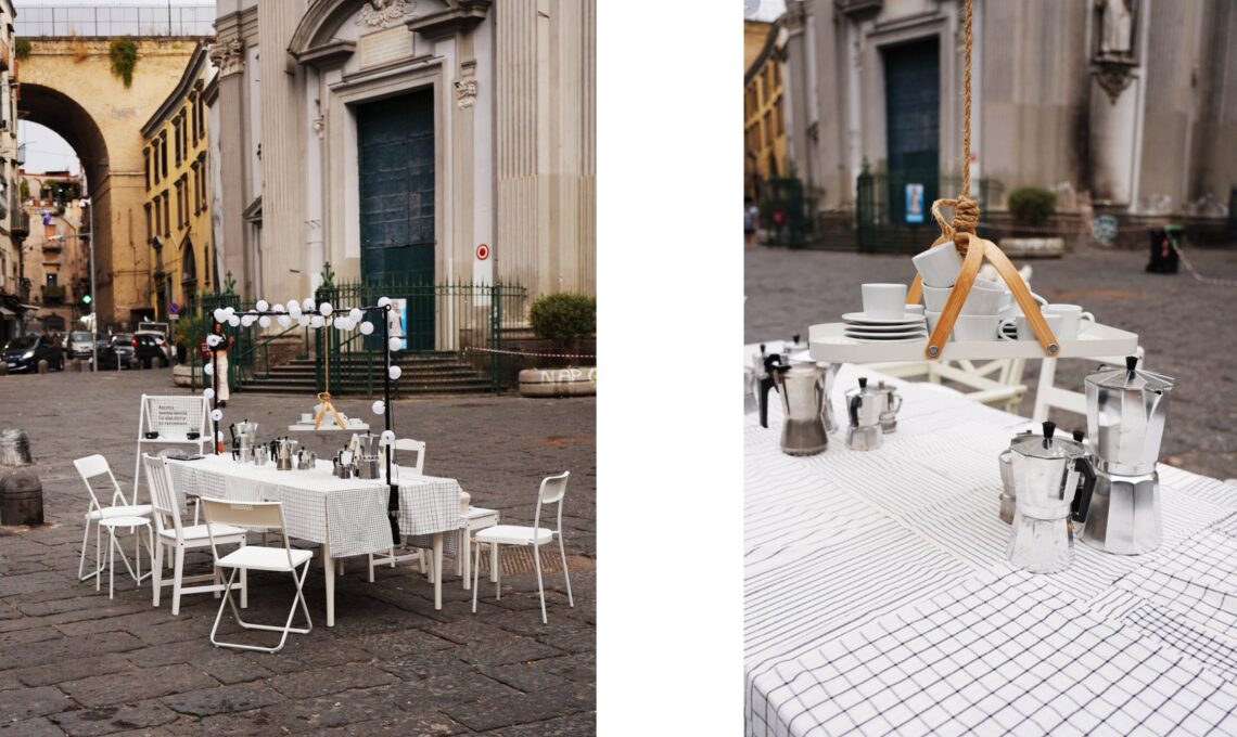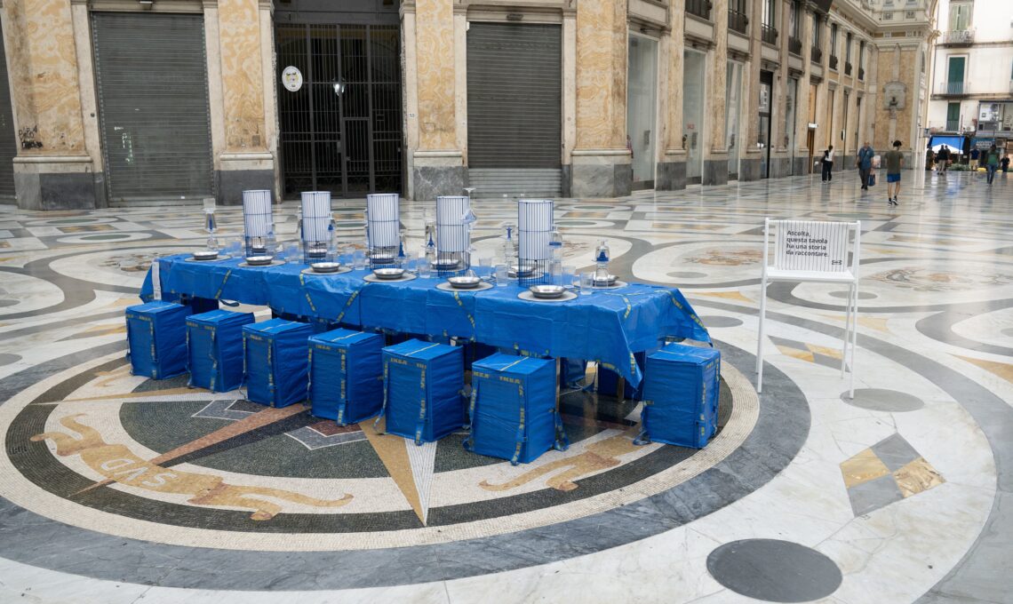 L’installazione, ispirata a una cucina collettiva nei Quartieri Spagnoli, trasforma lo spazio urbano in luogo di scambio e relazione. La FRAKTA, protagonista visiva, si reinventa.