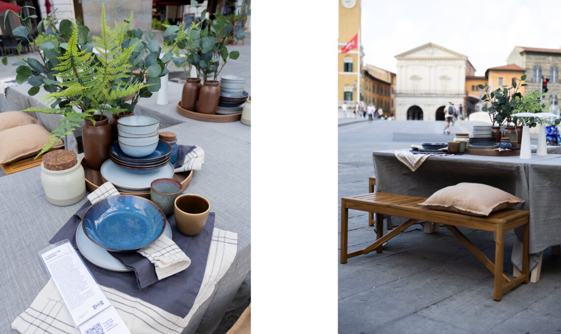 Anche al Sud, la tavola è diventata racconto di identità. A Bari l’allestimento in via Sparano ha celebrato la tradizione attraverso le ceramiche pugliesi di Enza Fasano, trasformando la mise en place in un dialogo tra artigianato e vita quotidiana. A Milano, Napoli, Roma, come Pisa, Parma, Pescara e Catania, le tavole sono state co-create con designer, content creator, associazioni e co-worker IKEA, ciascuna con dettagli che richiamavano storie locali: dalla piazza come luogo di incontro, al cibo come linguaggio universale, fino ai legami di comunità nati in progetti di co-housing o in momenti di social eating.