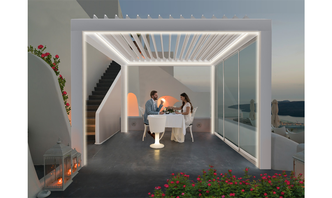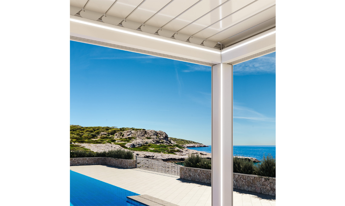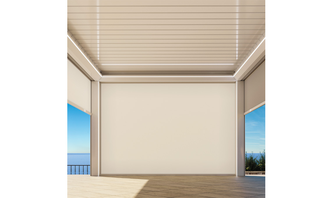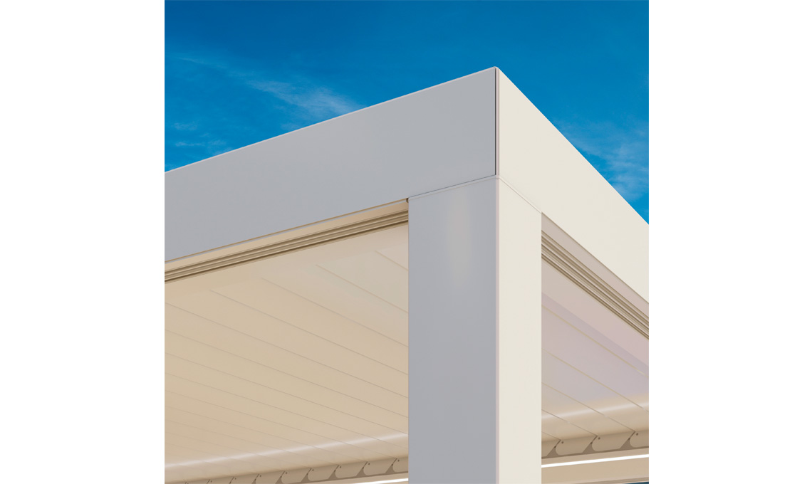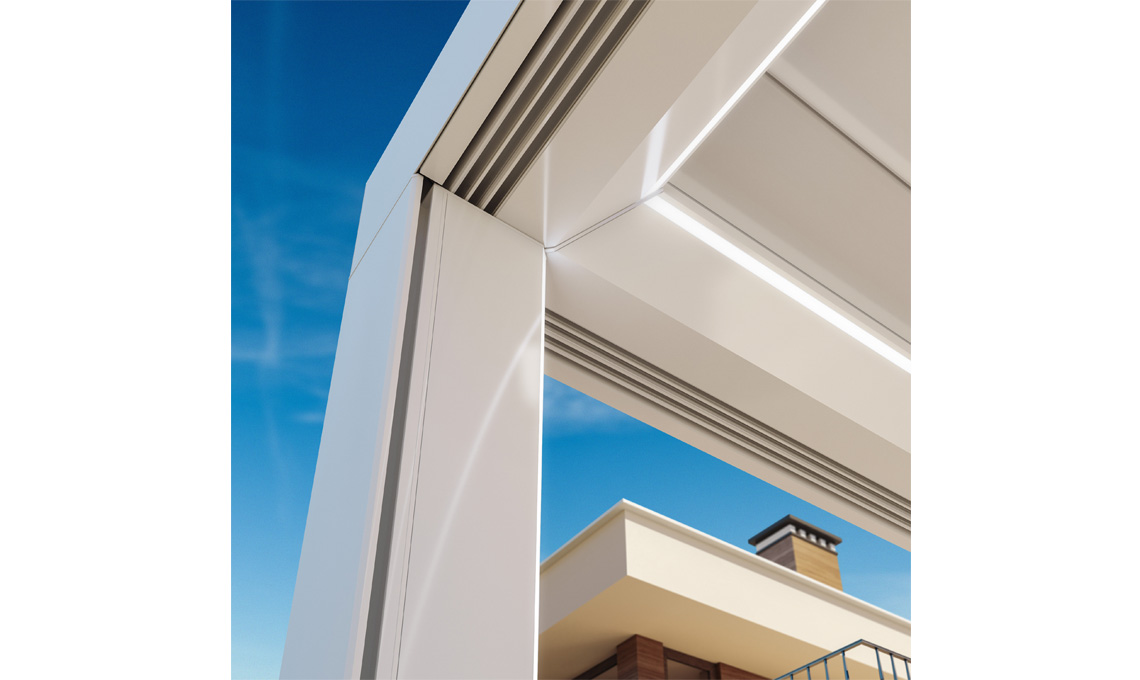 Ciò che la rende veramente speciale è l'integrazione di ogni elemento nella struttura: il motore, le luci, le guarnizioni, le gronde. Ogni elemento viene integrato in modo innovativo nelle linee minimal della pergola, e con un telecomando puoi gestire l'orientamento migliore delle lamelle. Molto facile e confortevole.